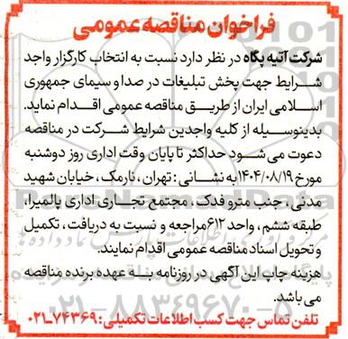 تلفن:5- 88349670 (021) فکس: 88349673 (021) Website: www.ParsNamadData.com E-mail: Info@ParsNamadData.com فراخوان مناقصه عمومی انتخاب کارگزار واجد شرایط جهت پخش تبلیغات در صدا و سیمای جمهوری اسلامی ایران