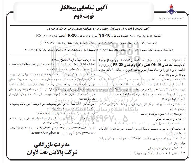 شرکت پالایش نفت لاوان در نظر دارد استحصال فلزات گران بها از دو نوع کاتالیست تک فلزی 10-YG غنی از کلر و دو فلزی 20-FR را پس از انجام فرآیند ارزیابی کیفی و احراز صلاحیت از طریق مناقصه عمومی به پیمانکار با سابقه مجرب و واجد شرایط واگذار نماید.