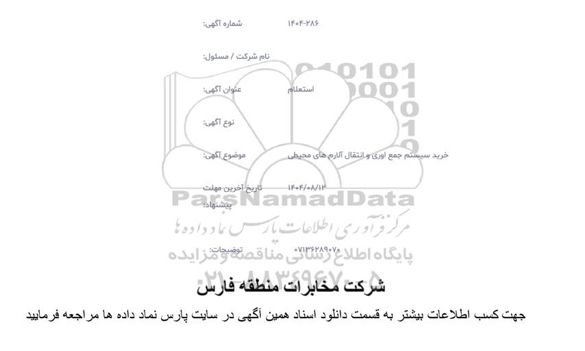 تلفن:5- 88349670 (021) فکس: 88349673 (021) Website: www.ParsNamadData.com E-mail: Info@ParsNamadData.com استعلام خرید سیستم جمع آوری و انتقال آلارم های محیطی