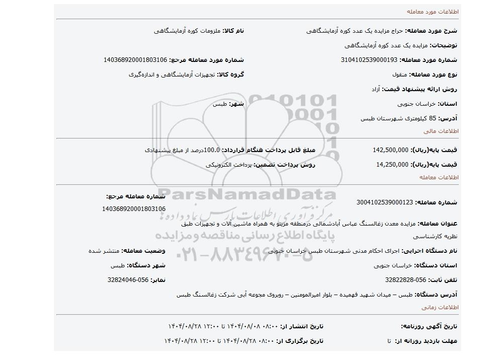 مزایده مزایده یک عدد کوره آزمایشگاهی