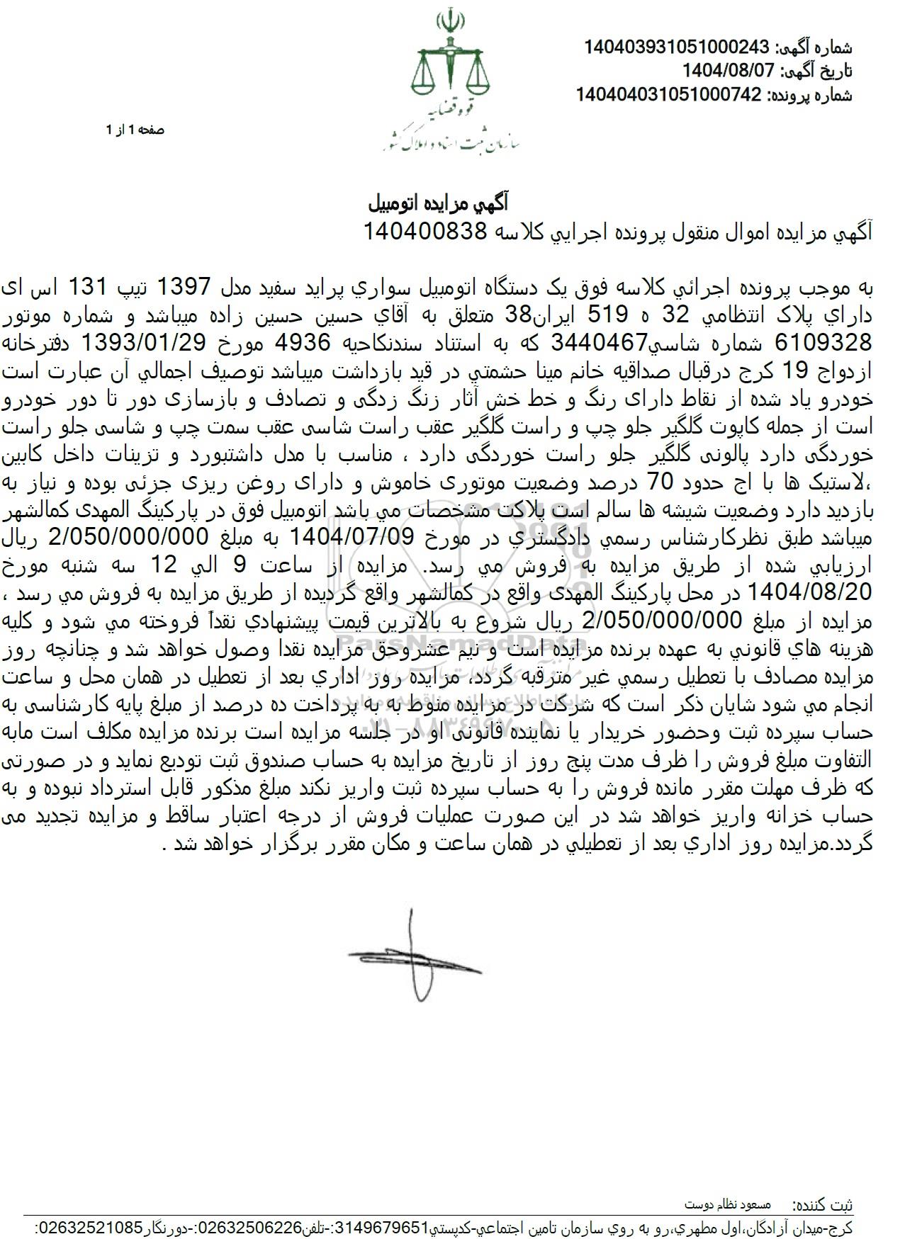به موجب پرونده اجرائي کلاسه فوق یک دستگاه اتومبیل سواری پراید سفید مدل 1397 تیپ 131 اس ای دارای پلاک انتظامي 32 519 ایران 38 متعلق به آقای حسین حسین زاده میباشد و شماره موتور 6109328 شماره شاسي 3440467 که به استناد سندنكاحيه 4936 مورخ 1393.01.29 دفترخانه ازدواج 19 کرج در قبال صداقیه خانم مینا حشمتی در قید بازداشت میباشد توصیف اجمالی آن عبارت است خودرو یاد شده از نقاط دارای رنگ و خط خش آثار زنگ زدگی و تصادف و بازسازی دور تا دور خودرو است از جمله کاپوت گلگیر جلو چپ و راست گلگیر عقب راست شاسی عقب سمت چپ و شاسی جلو راست خوردگی دارد پالونی گلگیر جلو راست خوردگی دارد، مناسب با مدل داشتبورد و تزینات داخل کابین لاستیک ها با آج حدود 70 درصد وضعیت موتوری خاموش و دارای روغن ریزی جزئی بوده و نیاز به بازدید دارد وضعیت شیشه ها سالم است پلاکت مشخصات مي باشد اتومبیل فوق در پارکینگ المهدی کمالشهر میباشد طبق نظر کارشناس رسمی دادگستري در مورخ 1404.07.09 به مبلغ 2.050.000.000 ريال ارزیابی شده از طریق مزایده به فروش می رسد. مزایده از ساعت 9 الي 12 سه شنبه مورخ 1404.08.20 در محل پارکینگ المهدی واقع در کمالشهر واقع گردیده از طریق مزایده به فروش می رسد . مزایده از مبلغ 2.050.000.000 ريال شروع به بالاترین قیمت پیشنهادی نقدا فروخته می شود و کلیه هزينه هاي قانوني به عهده برنده مزایده است و نیم عشر و حق مزایده نقدا وصول خواهد شد و چنانچه روز مزایده مصادف با تعطیل رسمي غیر مترقبه گردد مزایده روز اداری بعد از تعطیل در همان محل و ساعت انجام می شود شایان ذکر است که شرکت در مزایده منوط به به پرداخت ده درصد از مبلغ پایه کارشناسی به حساب سپرده ثبت و حضور خریدار یا نماینده قانونی او در جلسه مزایده است برنده مزایده مکلف است ما به التفاوت مبلغ فروش را ظرف مدت پنج روز از تاریخ مزایده به حساب صندوق ثبت تودیع نماید و در صورتی که ظرف مهلت مقرر مانده فروش را به حساب سپرده ثبت واریز نکند مبلغ مذکور قابل استرداد نبوده و به حساب خزانه واریز خواهد شد در این صورت عملیات فروش از درجه اعتبار ساقط و مزایده تجدید می گردد. مزایده روز اداری بعد از تعطیلی در همان ساعت و مکان مقرر برگزار خواهد شد .