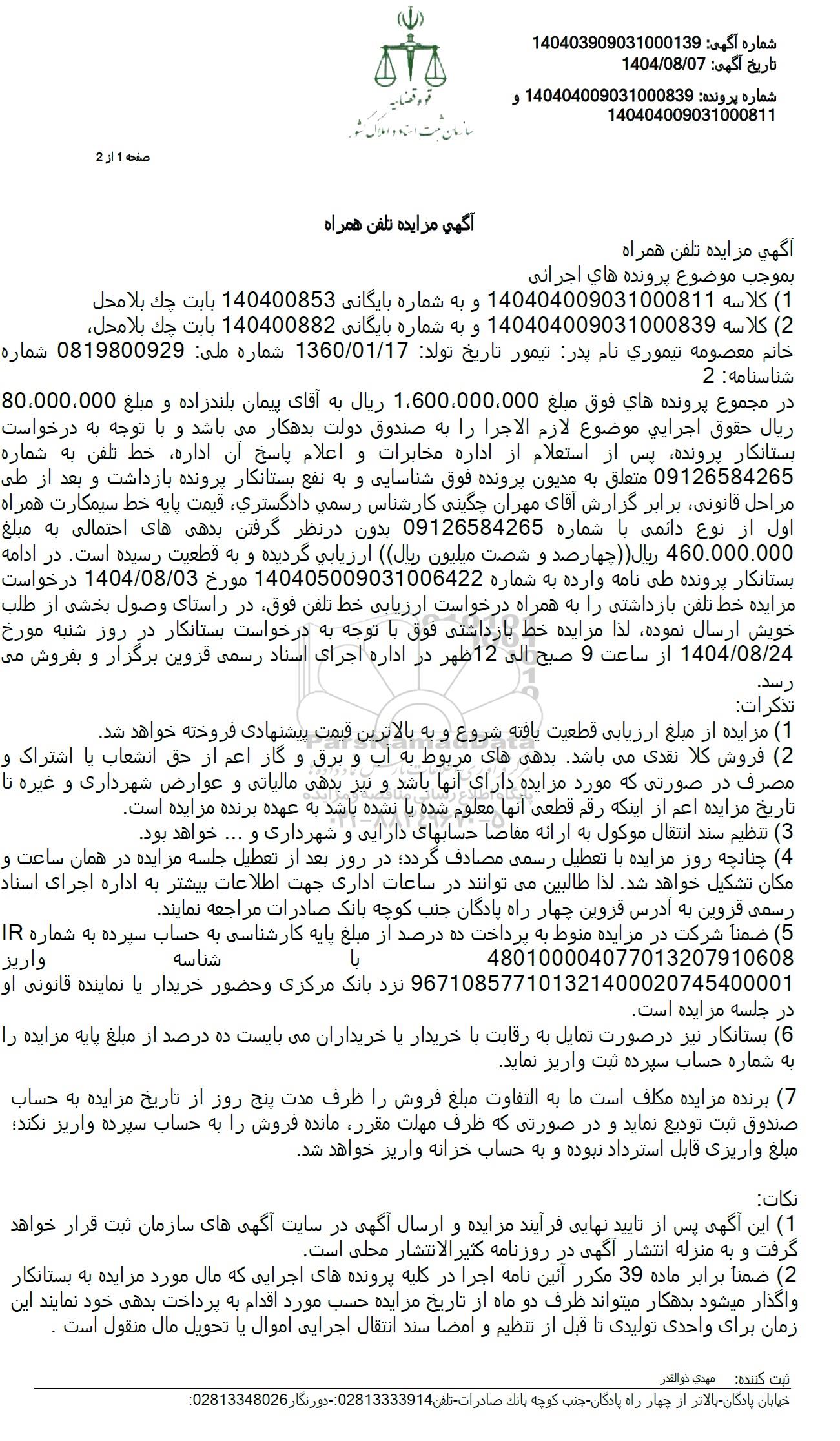 در مجموع پرونده هاي فوق مبلغ 1,600,000,000 ریال به آقای پیمان بلندزاده و مبلغ 80.000.000 ریال حقوق اجرايي موضوع لازم الاجرا را به صندوق دولت بدهکار میباشد و با توجه به درخواست بستانکار پرونده پس از استعلام از اداره مخابرات و اعلام پاسخ آن اداره خط تلفن به شماره 09126584265 متعلق به مدیون پرونده فوق شناسایی و به نفع بستانکار پرونده بازداشت و بعد از طی مراحل قانونی برابر گزارش آقای مهران چگینی کارشناس رسمی دادگستری قیمت پایه خط سیمکارت همراه اول از نوع دائمی با شماره 09126584265 بدون در نظر گرفتن بدهی های احتمالی به مبلغ 460.00 ریال چهار صد و شصت میلیون ریال ارزیابی گردیده و به قطعیت رسیده است. در ادامه بستانکار پرونده طی نامه وارده به شماره 140405009031006422 مورخ 1404.08.03 درخواست مزایده خط تلفن بازداشتی را به همراه درخواست ارزیابی خط تلفن فوق در راستای وصول بخشی از طلب خویش ارسال نموده، لذا مزایده خط بازداشتی فوق با توجه به درخواست بستانکار در روز شنبه مورخ 1404.08.24 از ساعت 9 صبح الى 12 ظهر در اداره اجرای اسناد رسمی قزوین برگزار و بفروش می رسد.