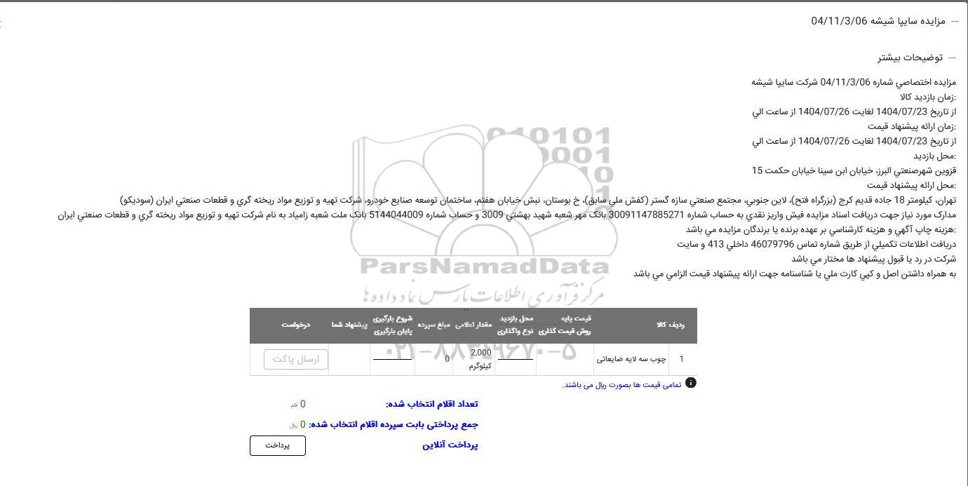 مزایده اختصاصی شماره 04/11/3/06 شرکت سایپا شیشه