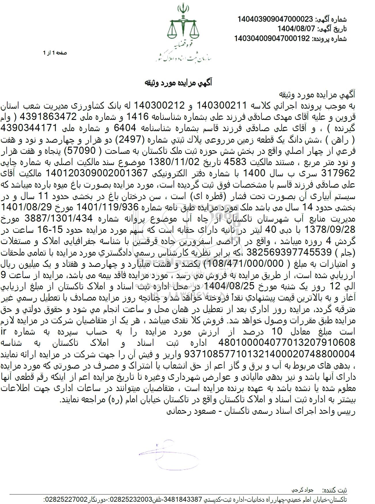 به موجب پرونده اجرائي کلاسه 140300211 و 140300212 له بانک کشاورزی مدیریت شعب استان قزوین و علیه آقای مهدی صادقی فرزند علی بشماره شناسنامه 1416 و شماره ملی 4391863472 ) وام گیرنده ) ، و آقای علی صادقی فرزند قاسم بشماره شناسنامه 6404 و شماره ملی 4390344171 ) راهن ) ، شش دانگ یک قطعه زمین مزروعی پلاک ثبتی شماره 2497) دو هزار و چهارصد و نود و هفت فرعي از چهار اصلی واقع در بخش شش حوزه ثبت ملک تاکستان به مساحت ( 57090) پنجاه و هفت هزار و نود متر مربع ، مستند مالکیت 4583 تاریخ 1380.11.02 موضوع سند مالکیت اصلی به شماره چاپی 317962 سری ب سال 1400 با شماره دفتر الکترونیکی 140120309002001367 مالکیت آقای على صادقی فرزند قاسم با مشخصات فوق ثبت گردیده است مورد مزایده بصورت باغ میوه بارده میباشد که سیستم آبیاری آن بصورت تحت فشار قطره ای است ، سن درختان باغ در بخشی حدود 11 سال و در بخشی حدود 14 سال میباشد ملک مورد مزایده طبق نامه شماره 1401.119.936 مورخ 1401.08.29 مدیریت منابع آب شهرستان تاکستان از چاه آب موضوع پروانه شماره 3887.1301.434 مورخ 1378.09.28 با دبی 40 لیتر در ثانیه دارای حقابه است که سهم مورد مزایده حدود 15-16 ساعت در گردش 4 روزه میباشد ، واقع در اراضی اسفرورین جاده قرقسین با شناسه جغرافیایی املاک و مستغلات (جام ( 382569397745539 که برابر نظریه کارشناس رسمی دادگستری مورد مزایده با تمامی ملحقات و امتیازات به مبلغ ( 108.471.000.000) یکصد و هشت میلیارد و چهارصد و هفتاد و یک میلیون ریال ارزیابی شده است از طریق مزایده به فروش میرسد ، مورد مزایده فاقد بیمه می باشد، مزایده از ساعت 9 الي 12 روز یک شنبه مورخ 1404.08.25 در محل اداره ثبت اسناد و املاک تاکستان از مبلغ ارزیابی آغاز و به بالاترین قیمت پیشنهادی نقدا فروخته خواهد شد و چنانچه روز مزایده مصادف با تعطیل رسمي غير مترقبه ،گردد مزایده روز اداری بعد از تعطیل در همان محل و ساعت انجام می شود و حقوق دولتي و حق مزایده طبق مقررات وصول خواهد شد. فروش کلا نقدی میباشد ، هر یک از متقاضیان شرکت در مزایده لازم است مبلغ معادل 10 درصد از ارزش مورد مزایده را به حساب سپرده به شماره ir و املاک تاکستان به شناسه 937108577101321400020748800004 واریز و فیش آن را جهت شرکت در مزایده ارائه نمایند ، بدهی های مربوط به آب و برق و گاز اعم از حق انشعاب یا اشتراک و مصرف در صورتی که مورد مزایده دارای آنها باشد و نیز بدهی مالیاتی و عوارض شهرداری و غیره تا تاریخ مزایده اعم از اینکه رقم قطعی آنها معلوم شده یا نشده باشد به عهده برنده مزایده است، متقاضیان میتوانند در ساعات اداری جهت اطلاعات 480100004077013207910608 اداره ثبت اسناد بیشتر به اداره ثبت اسناد و املاک تاکستان واقع در تاکستان خیابان امام (ره) مراجعه نمایند.