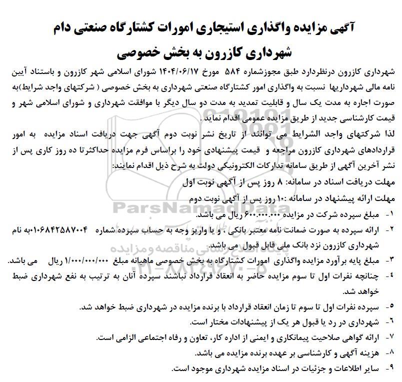 شهرداری کازرون در نظر دارد طبق مجوز شماره 584 مورخ 1404.06.17 شورای اسلامی شهر کازرون و باستناد آیین نامه مالی شهرداریها نسبت به واگذاری امور کشتارگاه صنعتی شهرداری به بخش خصوصی (شرکتهای واجد شرایط) به صورت اجاره به مدت یک سال و قابلیت تمدید به مدت دو سال دیگر با موافقت شهرداری و شورای اسلامی شهر و قیمت کارشناسی جدید از طریق مزایده عمومی اقدام نماید .