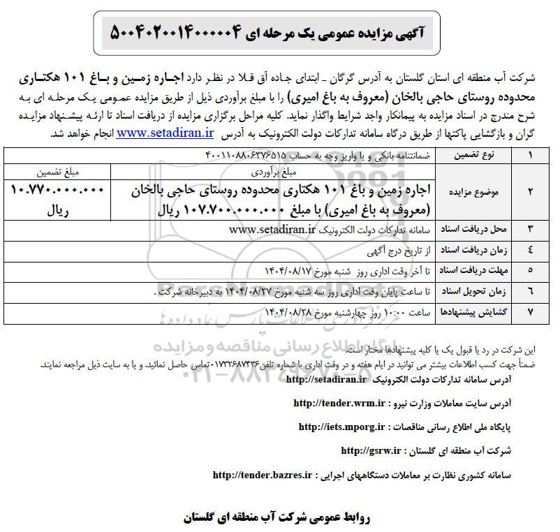 شرکت آب منطقه ای استان گلستان به آدرس گرگان - ابتدای جاده آق قلا در نظر دارد ذیل برای یک دوره زراعی از طریق مزایده عمومی یک مرحله ای به شرح مندرج در اسناد مزایده به پیمانکار واجد شرایط واگذار نماید. کلیه مراحل برگزاری مزایده از دریافت اسناد تا ارئه پیشنهاد مزایده گران و بازگشایی پاکت ها از طریق درگاه سامانه تدارکات دولت الکترونیک انجام خواهد شد.