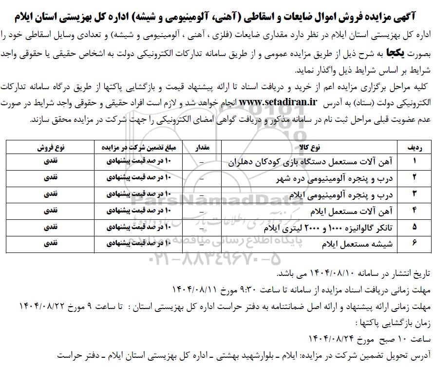 آگهی مزایده فروش اموال ضایعات و اسقاطی (آهنی، آلومینیومی و شیشه) اداره کل بهزیستی استان ایلام ؟