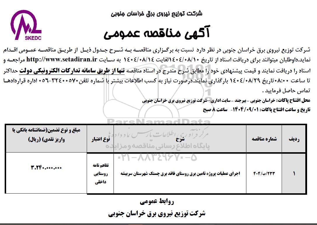 شرکت توزیع نیروی برق خراسان جنوبی در نظر دارد نسبت به برگزاری مناقصه به شرح جدول ذیل از طریق مناقصه عمومی اقدام نماید. داوطلبان میتوانند برای دریافت اسناد از تاریخ 1404.٠8.10 لغايت 1404.8.14 به سایت ستاد ایران مراجعه و اسناد را دریافت نمایند و قیمت پیشنهادی خود را مطابق شرح مندرج در اسناد مناقصه تنها از طریق سامانه تدارکات الکترونیکی دولت حداکثر تا ساعت 08:00 تاریخ 1404.08.29 بارگذاری نمایند. در صورت نیاز به کسب اطلاعات بیشتر با شماره تلفن 32400570-056 اداره قراردادها تماس حاصل فرمایید.