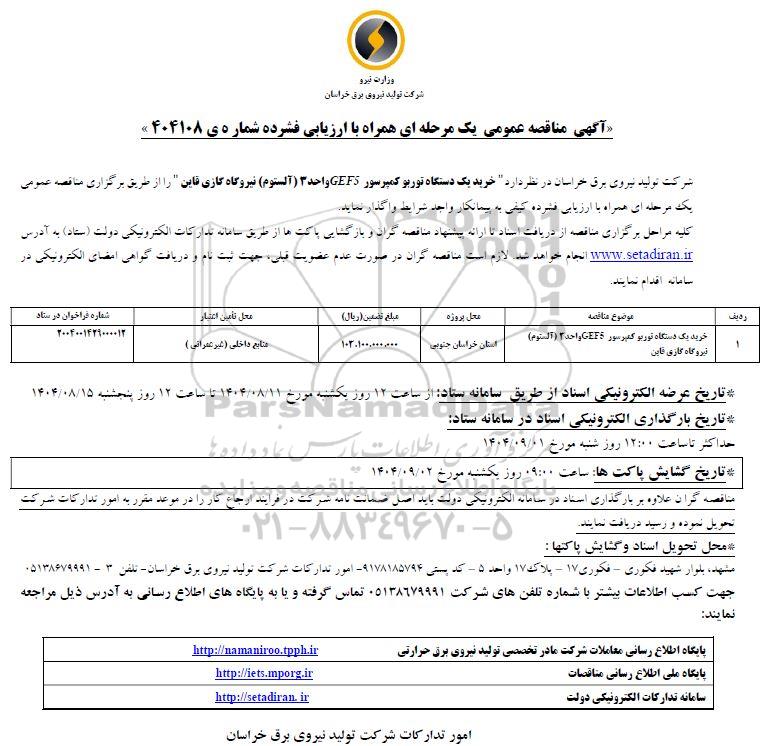 شرکت تولید نیروی برق خراسان در نظر دارد خرید یک دستگاه توربو کمپرسور GEF5 واحد 3 (آلستوم) نیروگاه گازی قائن را از طریق برگزاری مناقصه عمومی یک مرحله ای همراه با ارزیابی فشرده کیفی به پیمانکار واجد شرایط واگذار نماید.