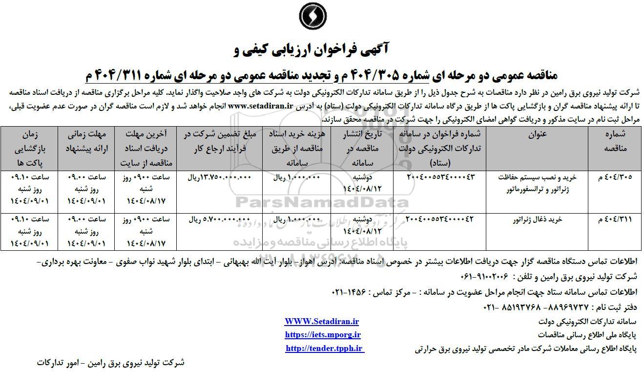 آگهی فراخوان ارزیابی کیفی و مناقصه عمومی دو مرحله ای شماره 404/305 م و تجدید مناقصه عمومی دو مرحله ای شماره 404.311 م