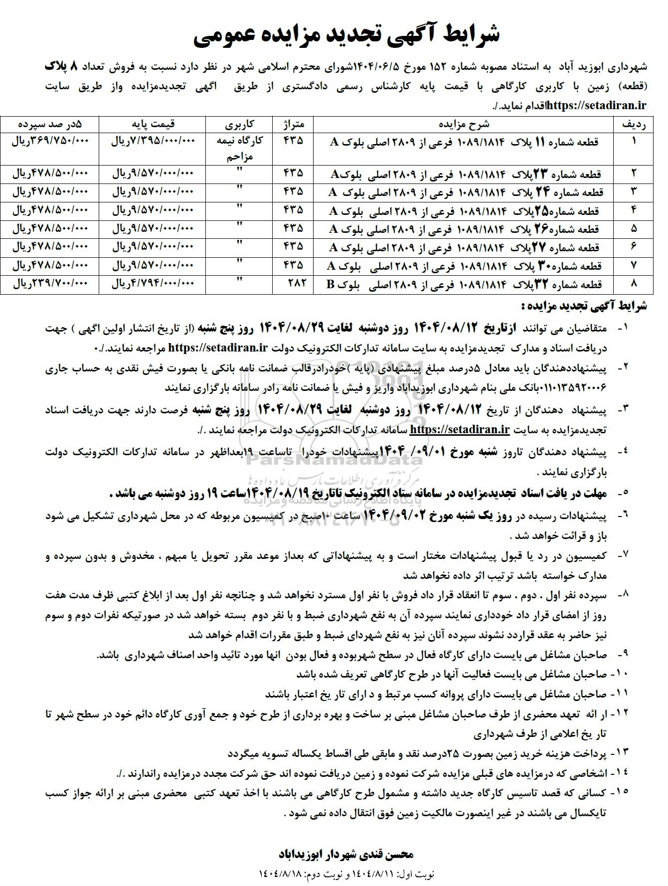 شهرداری ابوزید آباد به استناد مصوبه شماره 152 مورخ 1404.6.5 شورای محترم اسلامی شهر در نظر دارد نسبت به فروش تعداد 8 پلاک (قطعه) زمین با کاربری کارگاهی با قیمت پایه کارشناس رسمی دادگستری از طریق تجدید مزایده و از طریق سایت ستاد ایران اقدام نماید.