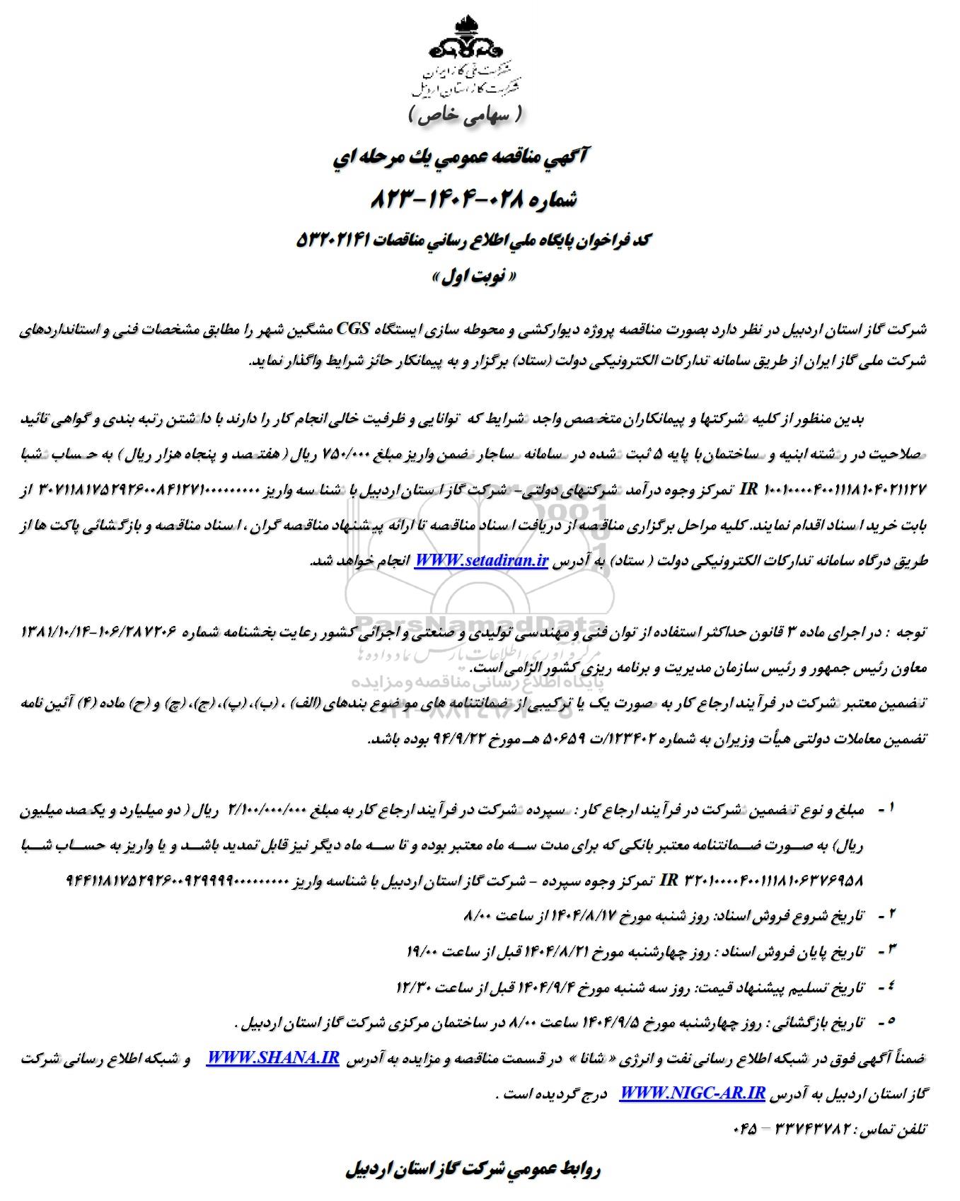 شرکت گاز استان اردبیل در نظر دارد بصورت مناقصه پروژه دیوارکشی و محوطه سازی ایستگاه CGS مشگین شهر را مطابق مشخصات فنی و استانداردهای شرکت ملی گاز ایران از طریق سامانه تدارکات الکترونیکی دولت (ستاد) برگزار و به پیمانکار حائز شرایط واگذار نماید.