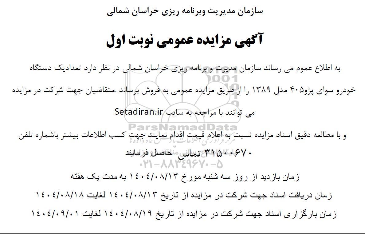 تلفن:5- 88349670 (021) فکس: 88349673 (021) Website: www.ParsNamadData.com E-mail: Info@ParsNamadData.com مزایده فروش تعداد یک دستگاه خودرو سوای پژو 405 مدل 1389