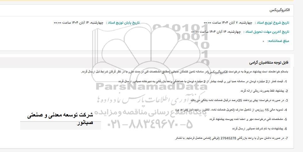 با سلام خواهشمند است پیشنهاد مربوط به درخواست الکتروگیربکس در سامانه تامین کنندگان صبانور ) مطابق مشخصات فنی در مدت مقرر با در نظر گرفتن شرایط ذیل ارسال گردد.