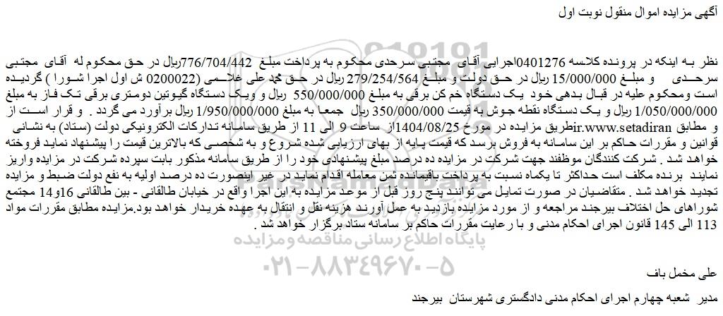 نظر به اینکه در پرونده کلاسه 0401276اجرایی آقای مجتبی سرحدی محکوم به پرداخت مبلغ 776/704/442ریال در حق محکوم له آقای مجتبی سرحدی و مبلغ 15/000/000 ریال در حق دولت و مبلغ 279/254/564 ریال در حق محمد علی غلامی (0200022 ش اول اجرا شورا ) گردیده است ومحکوم علیه در قبال بدهی خود یک دستگاه خم کن برقی به مبلغ 550/000/000 ریال و ویک دستگاه گیوتین دومتری برقی تک فاز به مبلغ 1/050/000/000 ریال و یک دستگاه نقطه جوش به قیمت 350/000/000 ریال جمعا به مبلغ 1/950/000/000 ریال برآورد می گردد . و قرار است از طریق مزایده در مورخ 1404/08/25از ساعت 9 الی 11 از طریق سامانه تدارکات الکترونیکی دولت (ستاد) به نشانی سایت ستاد ایران و مطابق قوانین و مقررات حاکم بر این سامانه به فروش برسد که قیمت پایه از بهای ارزیابی شده شروع و به شخصی که بالاترین قیمت را پیشنهاد نماید فروخته خواهد شد . شرکت کنندگان موظفند جهت شرکت در مزایده ده درصد مبلغ پیشنهادی خود را از طریق سامانه مذکور بابت سپرده شرکت در مزایده واریز نمایند برنده مکلف است حداکثر تا یکماه نسبت به پرداخت باقیمانده ثمن معامله اقدام نماید در غیر اینصورت ده درصد اولیه به نفع دولت ضبط و مزایده تجدید خواهد شد . متقاضیان در صورت تمایل می توانند پنج روز قبل از موعد مزایده به این اجرا واقع در خیابان طالقانی - بین طالقانی 16و14 مجتمع شوراهای حل اختلاف بیرجند مراجعه و از مورد مزایده بازدید به عمل آورند هزینه نقل و انتقال به عهده خریدار خواهد بود.مزایده مطابق مقررات مواد 113 الی 145 قانون اجرای احکام مدنی و با رعایت مقررات حاکم بر سامانه ستاد برگزار خواهد شد .