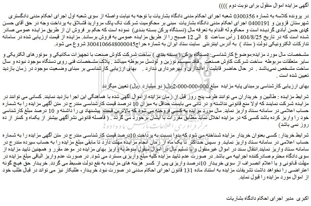 در پرونده کلاسه به شماره 0300356 شعبه اجرای احکام مدنی دادگاه بشاریات با توجه به نیابت واصله از سوی شعبه اول اجرای احکام مدنی دادگستری شهرستان قزوین و 0400191 اجرای احکام مدنی دادگاه بشاریات مبنی بر محکومیت شرکت تک پاک مروارید قشلاق به پرداخت وجه در حق آقای حسن محمدی حسن آبادی گردیده است و محکوم له اقدام به تعرفه مال (دستگاه پرکن بسته بندی) نموده است که حکم بر فروش ان از طریق مزایده عمومی صادر شده است که در تاریخ 1404/8/25 رأس ساعت 8 الی 12 صبح را از طریق مزایده عمومی به فروش برساند. مزایده از قیمت ارزیابی شده در سامانه تدارکات الکترونیکی دولت ( ستاد ) به آدرس اینترنتی سایت ستاد ایران به شماره حراج3004106648000045 شروع می شود.