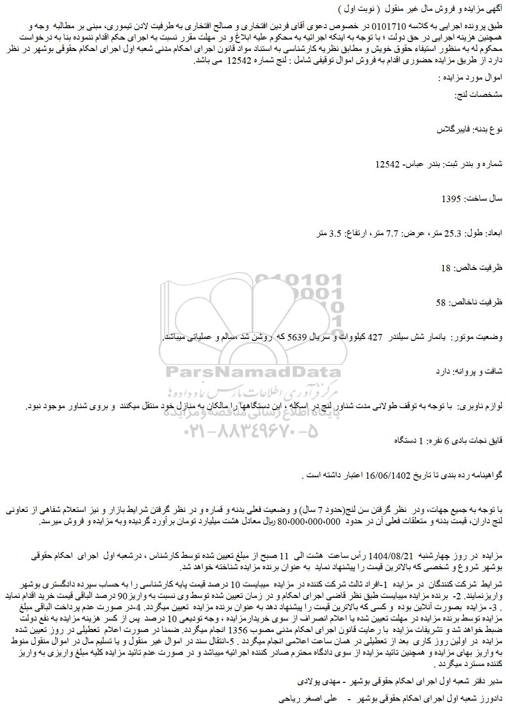 طبق پرونده اجرایی به کلاسه 0101710 در خصوص دعوی آقای فردین افتخاری و صالح افتخاری به طرفیت لادن تیموری، مبنی بر مطالبه وجه و همچنین هزینه اجرایی در حق دولت ؛ با توجه به اینکه اجرائیه به محکوم علیه ابلاغ و در مهلت مقرر نسبت به اجرای حکم اقدام ننموده بنا به درخواست محکوم له به منظور استیفاء حقوق خویش و مطابق نظریه کارشناسی به استناد مواد قانون اجرای احکام مدنی شعبه اول اجرای احکام حقوقی بوشهر در نظر دارد از طریق مزایده حضوری اقدام به فروش اموال توقیفی شامل : لنج شماره 12542 می باشد.