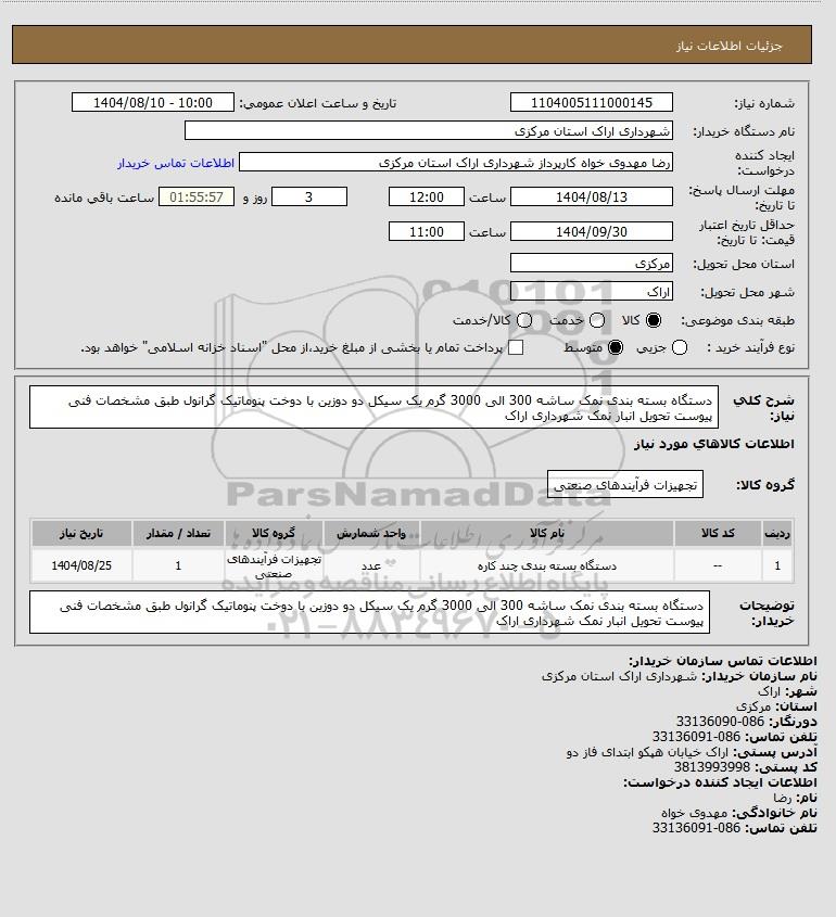 تلفن:5- 88349670 (021) فکس: 88349673 (021) Website: www.ParsNamadData.com E-mail: Info@ParsNamadData.com استعلام دستگاه بسته بندی نمک ساشه 300 الی 3000 گرم یک سیکل دو دوزین با دوخت پنوماتیک گرانول طبق مشخصات فنی پیوست تحویل انبار نمک شهرداری اراک