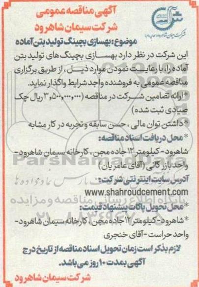 تلفن:5- 88349670 (021) فکس: 88349673 (021) Website: www.ParsNamadData.com E-mail: Info@ParsNamadData.com مناقصه بهسازی بچینگ تولید بتن آماده
