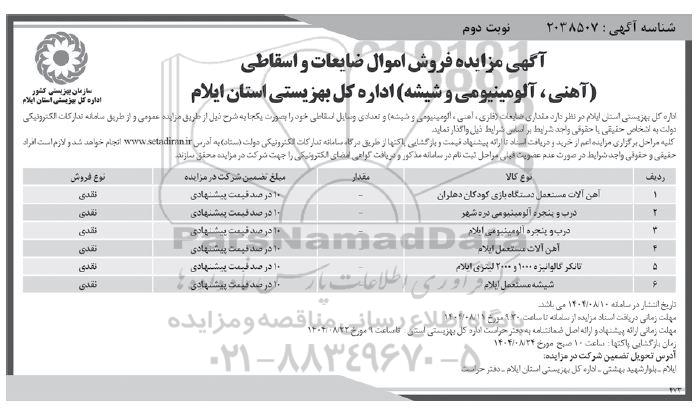 آگهی مزایده فروش اموال ضایعات و اسقاطی (آهنی، آلومینیومی و شیشه) اداره کل بهزیستی استان ایلام نوبت دوم