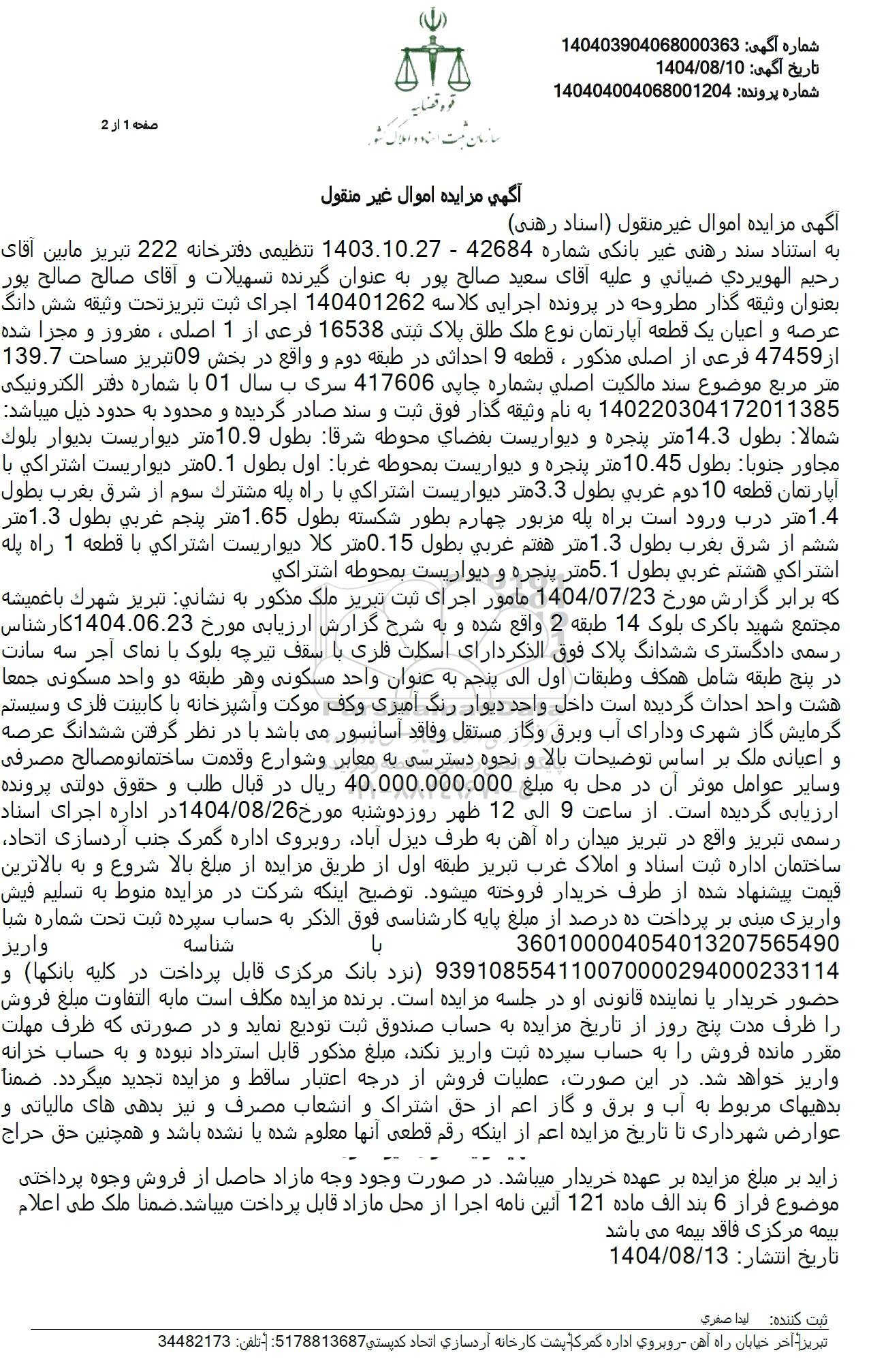 به استناد سند رهنی غیر بانکی شماره 42684 - 1403.10.27 تنظیمی دفترخانه 222 تبریز مابین آقای رحيم الهويردي ضيائي و علیه آقای سعید صالح پور به عنوان گیرنده تسهیلات و آقای صالح صالح پور بعنوان وثیقه گذار مطروحه در پرونده اجرایی کلاسه 140401262 اجرای ثبت تبریز تحت وثیقه شش دانگ عرصه و اعیان یک قطعه آپارتمان نوع ملک طلق پلاک ثبتی 16538 فرعی از 1 اصلی ، مفروز و مجزا شده از 47459 فرعی از اصلی مذکور ، قطعه 9 احداثی در طبقه دوم و واقع در بخش 09 تبریز مساحت 139.7 متر مربع موضوع سند مالکیت اصلی بشماره چاپی 417606 سری به سال 01 با شماره دفتر الکترونیکی 140220304172011385 به نام وثیقه گذار فوق ثبت و سند صادر گردیده و محدود به حدود ذیل میباشد شمالا بطول 14.3 متر پنجره و دیواریست بفضاي محوطه شرقا بطول 10.9 متر دیواریست بدیوار بلوك مجاور جنوبا بطول 10.45 متر پنجره و دیواریست بمحوطه غربا اول بطول 0.1 متر دیواریست اشتراکی با آپارتمان قطعه 10 دوم غربي بطول 3.3 متر دیواریست اشتراکی با راه پله مشترك سوم از شرق بغرب بطول 1.4 متر درب ورود است براه پله مزبور چهارم بطور شکسته بطول 1.65 متر پنجم عربي بطول 1.3 متر ششم از شرق بغرب بطول 1.3 متر هفتم غربي بطول 0.15 متر کلا ديواريست اشتراکی با قطعه 1 راه پله اشتراکی هشتم غربي بطول 5.1 متر. پنجره و دیواریست بمحوطه اشتراكی که برابر گزارش مورخ 1404.07.23 مامور اجرای ثبت تبریز ملک مذکور به نشاني تبريز شهرك باغميشه مجتمع شهید باکری بلوک 14 طبقه 2 واقع شده و به شرح گزارش ارزیابی مورخ 1404.06.23 کارشناس رسمی دادگستری ششدانگ پلاک فوق الذکر دارای اسکلت فلزی با سقف تیرچه بلوک با نمای آجر سه سانت در پنج طبقه شامل همکف و طبقات اول الی پنجم به عنوان واحد مسکونی و هر طبقه دو واحد مسکونی جمعا هشت واحد احداث گردیده است داخل واحد دیوار رنگ آمیزی و کف موکت و آشپزخانه با کابینت فلزی و سیستم گرمایش گاز شهری و دارای آب و برق و گاز مستقل و فاقد آسانسور میباشد با در نظر گرفتن ششدانگ عرصه و اعیانی ملک بر اساس توضیحات بالا و نحوه دسترسی به معابر و شوارع و قدمت ساختمان و مصالح مصرفی و سایر عوامل موثر آن در محل به مبلغ 40.000.000.000 ریال در قبال طلب و حقوق دولتی پرونده ارزیابی گردیده است. از ساعت 9 الی 12 ظهر روز دوشنبه مورخ 1404.08.26 در اداره اجرای استاد رسمی تبریز واقع در تبریز میدان راه آهن به طرف دیزل آباد روبروی اداره گمرک جنب آردسازی اتحاد ساختمان اداره ثبت اسناد و املاک غرب تبریز طبقه اول از طریق مزایده از مبلغ بالا شروع و به بالاترین قیمت پیشنهاد شده از طرف خریدار فروخته میشود توضیح اینکه شرکت در مزایده منوط به تسلیم فیش واریزی مبنی بر پرداخت ده درصد از مبلغ پایه کارشناسی فوق الذکر به حساب سپرده ثبت تحت شماره شبا 360100004054013207565490 یا شناسه واريز 939108554110070000294000233114 نزد بانک مرکزی قابل پرداخت در کلیه بانکها و حضور خریدار یا نماینده قانونی او در جلسه مزایده است. برنده مزایده مکلف است ما به التفاوت مبلغ فروش را ظرف مدت پنج روز از تاریخ مزایده به حساب صندوق ثبت تودیع نماید و در صورتی که ظرف مهلت مقرر مانده فروش را به حساب سپرده ثبت واریز نکند مبلغ مذکور قابل استرداد نبوده و به حساب خزانه واریز خواهد شد. در این صورت عملیات فروش از درجه اعتبار ساقط و مزایده تجدید میگردد. ضمناً بدهیهای مربوط به آب و برق و گاز اعم از حق اشتراک و انشعاب مصرف و نیز بدهی های مالیاتی و عوارض شهرداری تا تاریخ مزایده اعم از اینکه رقم قطعی آنها معلوم شده یا نشده باشد و همچنین حق حراج زاید بر مبلغ مزایده بر عهده خریدار میباشد. در صورت وجود وجه مازاد حاصل از فروش وجوه پرداختی موضوع فراز 6 بند الف ماده 121 آئین نامه اجرا از محل مازاد قابل پرداخت میباشد. ضمنا ملک طی اعلام بیمه مرکزی فاقد بیمه می باشد.