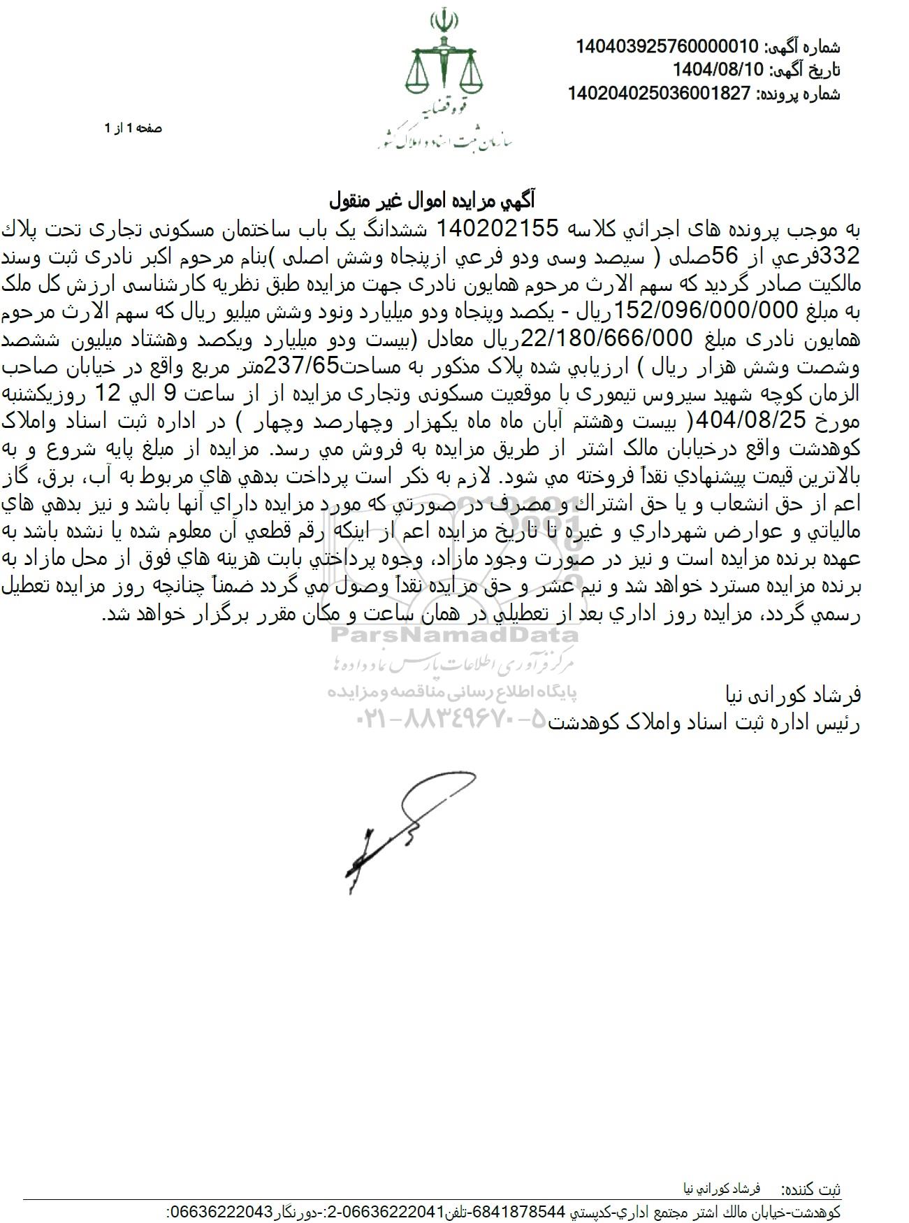 به موجب پروندههای اجرائی كلاسه 140202155 ششدانگ یک باب ساختمان مسکونی تجاری تحت پلاک 332 فرعی از 56 صلی ) سیصد و سی و دو فرعی از پنجاه و شش اصلی ( بنام مرحوم اکبر نادری ثبت وسند مالکیت صادر گردید که سهم الارث مرحوم همایون نادری جهت مزایده طبق نظریه کارشناسی ارزش کل ملک به مبلغ 152.096.000.000 ریال - یكصد و پنجاه و دو میلیارد و نود و شش میلیو ریال که سهم الارث مرحوم همایون نادری مبلغ 22.180.666.000 ریال معادل بیست و دو میلیارد و یكصد و هشتاد میلیون ششصد وشصت و شش هزار ریال ( ارزیابی شده پلاک مذکور به مساحت 237.65 متر مربع واقع در خیابان صاحب الزمان کوچه شهید سیروس تیموری با موقعیت مسکونی و تجاری مزایده از از ساعت 9 الی 12 روز یكشنبه مورخ 404.08.25) بیست و هشتم آبان ماه ماه یکهزار و چهارصد و چهار ( در اداره ثبت اسناد و املاک کوهدشت) واقع در خیابان مالک اشتر از طریق مزایده به فروش می رسد. مزایده از مبلغ پایه شروع و به بالاترین قیمت پیشنهادی نقدا فروخته می شود. لازم به ذکر است پرداخت بدهی های مربوط به آب برق گاز اعم از حق انشعاب و یا حق اشتراک و مصرف در صورتی که مورد مزایده دارای آنها باشد و نیز بدهی های مالیاتی و عوارض شهرداری و غیره تا تاریخ مزایده اعم از اینکه رقم قطعی آن معلوم شده یا نشده باشد به عهده برنده مزایده است و نیز در صورت وجود مازاد وجوه پرداختی بابت هزینه های فوق از محل مازاد به برنده مزایده مسترد خواهد شد و نیم عشر و حق مزایده نقدا وصول میگردد ضمنا چنانچه روز مزایده تعطیل رسمی گردد مزایده روز اداری بعد از تعطیلی در همان ساعت و مکان مقرر برگزار خواهد شد.