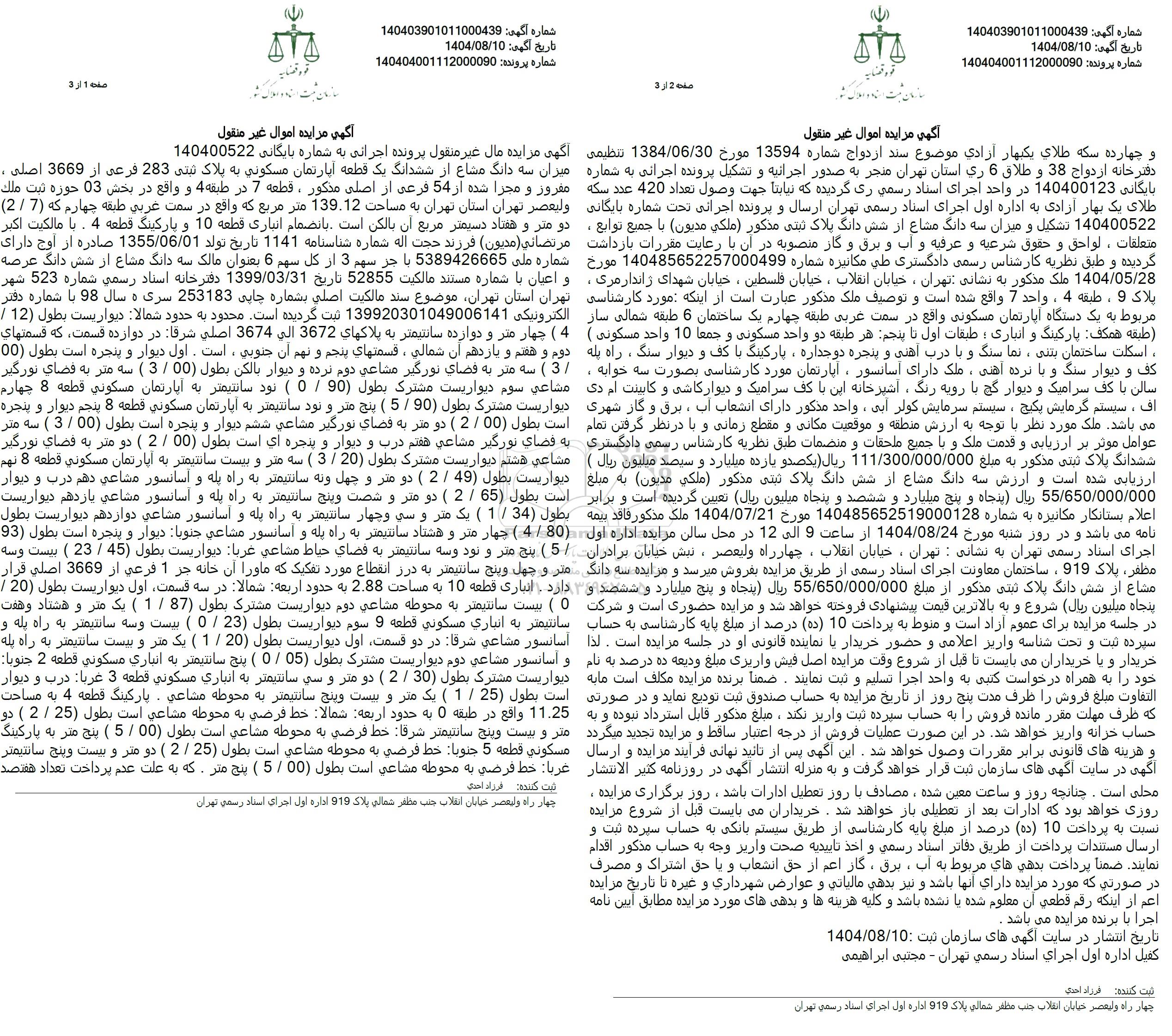 مزایده مال غیر منقول پرونده اجرائی به شماره بایگانی 140400522 میزان سه دانگ مشاع از ششدانگ یک قطعه آپارتمان مسکونی به پلاک ثبتی 283 فرعی از 3669 اصلی . مفروز و مجزا شده از 54 فرعی از اصلی مذکور، قطعه 7 در طبقه 4 و واقع در بخش 03 حوزه ثبت ملک ولیعصر تهران استان تهران به مساحت 139.12 متر مربع که واقع در سمت غربی طبقه چهارم که (2.7) دو متر و هفتاد دسیمتر مربع آن بالکن است با انضمام انباری قطعه 10 و پارکینگ قطعه 4 . با مالکیت اکبر مرتضائی (مدیون) فرزند حجت اله شماره شناسنامه 1141 تاریخ تولد 1355.06.01 صادره از اوج دارای شماره ملی 5389426665 با جز سهم 3 از کل سهم 6 بعنوان مالک سه دانگ مشاع از شش دانگ عرصه و اعیان با شماره مستند مالکیت 52855 تاريخ 1399.03.31 دفترخانه اسناد رسمی شماره 523 شهر تهران استان تهران موضوع سند مالکیت اصلی بشماره چاپی 253183 سری 5 سال 98 با شماره دفتر الکترونيکي 139920301049006141 ثبت گردیده است. محدود به حدود شمالا دیواریست بطول (12) .(4) چهار متر و دوازده سانتیمتر به پلاکهاي 3672 الي 3674 اصلی شرقا در دوازده قسمت که قسمتهای دوم و هفتم و یازدهم آن شمالي، قسمتهاي پنجم و نهم آن جنوبي است. اول دیوار و پنجره است بطول (00) (3) سه متر به فضای نورگیر مشاعی دوم نرده و دیوار بالکن يطول (00 . 3 ) سه متر به فضای نورگیر مشاعی سوم دیواریست مشترک بطول 90 . 0 ) نود سانتیمتر به آپارتمان مسکونی قطعه 8 چهارم دیواریست مشترک بطول (5.90 ) پنج متر و نود سانتیمتر به آپارتمان مسکونی قطعه 8 پنجم دیوار و پنجره است بطول 00 . 2 ) دو متر به فضای نورگیر مشاعی ششم دیوار و پنجره است بطول (00 . 3 ) سه متر به فضای نورگیر مشاعی هفتم درب و دیوار و پنجره ای است بطول 00 . 2 ) دو متر به فضای نورگیر مشاعی هشتم دیواریست مشترک بطول 20 . 3 ) سه متر و بیست سانتیمتر به آپارتمان مسکوني قطعه 8 نهم دیواریست بطول (49) . 2 ) دو متر و چهل و نه سانتیمتر به راه پله و آسانسور مشاعی دهم درب و دیوار است بطول 65 . 2 ) دو متر و شصت وپنج سانتیمتر به راه پله و آسانسور مشاعی یازدهم دیواریست بطول (34) . 1 ) یک متر و سی و چهار سانتیمتر به راه پله و آسانسور مشاعی دوازدهم دیواریست بطول (4.80 ) چهار متر و هشتاد سانتیمتر به راه پله و آسانسور مشاعی جنوبا دیوار و پنجره است بطول (93) (5) پنج متر و نود و سه سانتیمتر به فضاي حياط مشاعي غربا دیواریست بطول 45 . 23 ) بیست و سه متر و چهل و پنج سانتیمتر به درز انقطاع مورد تفکیک که ماورا آن خانه جر 1 فرعی از 3669 اصلی قرار دارد. انباری قطعه 10 به مساحت 2.88 به حدود اربعه شمالا در سه قسمت اول دیواریست بطول (20) .(0) بیست سانتیمتر به محوطه مشاعی دوم دیواریست مشترک بطول 87 . 1 ) یک متر و هشتاد و هفت سانتیمتر به انباري مسکوني قطعه 9 سوم دیواریست بطول 23 . 0 ) بیست و سه سانتیمتر به راه پله و اسانسور مشاعی شرقا در دو قسمت اول دیواریست بطول 20 . 1 ) یک متر و بیست سانتیمتر به راه پله و آسانسور مشاعی دوم دیواریست مشترک بطول (0.05 ) پنج سانتیمتر به انباري مسکوني قطعه 2 جنوبا : دیواریست مشترک بطول (30) . 2 ) دو متر و سی سانتیمتر به انباري مسکوني قطعه 3 غربا درب و دیوار است بطول 25 . 1 ) یک متر و بیست و پنج سانتیمتر به محوطه مشاعی پارکینگ قطعه 4 به مساحت 11.25 واقع در طبقه 0 به حدود اربعه شمالا خط فرضی به محوطه مشاعی است بطول 25 . 2 ) دو متر و بیست و پنج سانتیمتر شرقا خط فرضی به محوطه مشاعی است بطول (00 . 5) پنج متر به پارکینگ مسکوني قطعه 5 جنوبا خط فرضی به محوطه مشاعی است بطول 25 . 2 ) دو متر و بیست و پنج سانتیمتر غربا خط فرضی به محوطه مشاعي است بطول (00 . 5) پنج متر که به علت عدم پرداخت تعداد هفتصد