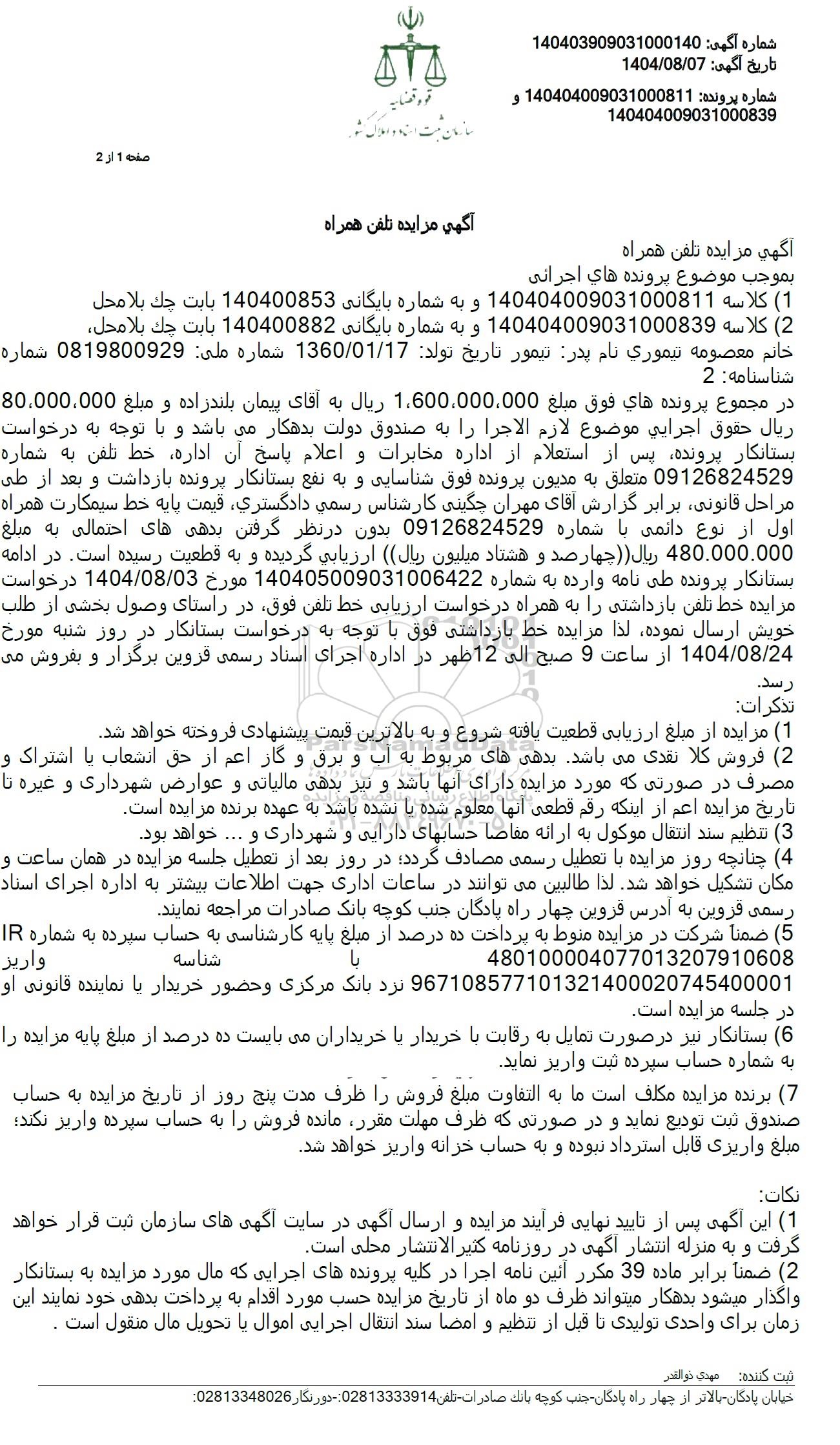 در مجموع پرونده هاي فوق مبلغ 1.600.000.000 ریال به آقای پیمان بلندزاده و مبلغ 80.000.000 ریال حقوق اجرايي موضوع لازم الاجرا را به صندوق دولت بدهکار میباشد و با توجه به درخواست بستانکار پرونده پس از استعلام از اداره مخابرات و اعلام پاسخ آن اداره، خط تلفن به شماره 09126824529 متعلق به مدیون پرونده فوق شناسایی و به نفع بستانکار پرونده بازداشت و بعد از طی مراحل قانونی برابر گزارش آقای مهران چگینی کارشناس رسمی دادگستری قیمت پایه خط سیمکارت همراه اول از نوع دائمی با شماره 09126824529 بدون در نظر گرفتن بدهی های احتمالی به مبلغ 480,000.000 ریال چهارصد و هشتاد میلیون ریال ارزیابی گردیده و به قطعیت رسیده است. در ادامه بستانکار پرونده طی نامه وارده به شماره 140405009031006422 مورخ 1404.08.03 درخواست مزایده خط تلفن بازداشتی را به همراه درخواست ارزیابی خط تلفن فوق در راستای وصول بخشی از طلب خویش ارسال نموده، لذا مزایده خط بازداشتی فوق با توجه به درخواست بستانکار در روز شنبه مورخ 1404.08.24 از ساعت 9 صبح الی 12 ظهر در اداره اجرای اسناد رسمی قزوین برگزار و بفروش می رسد.