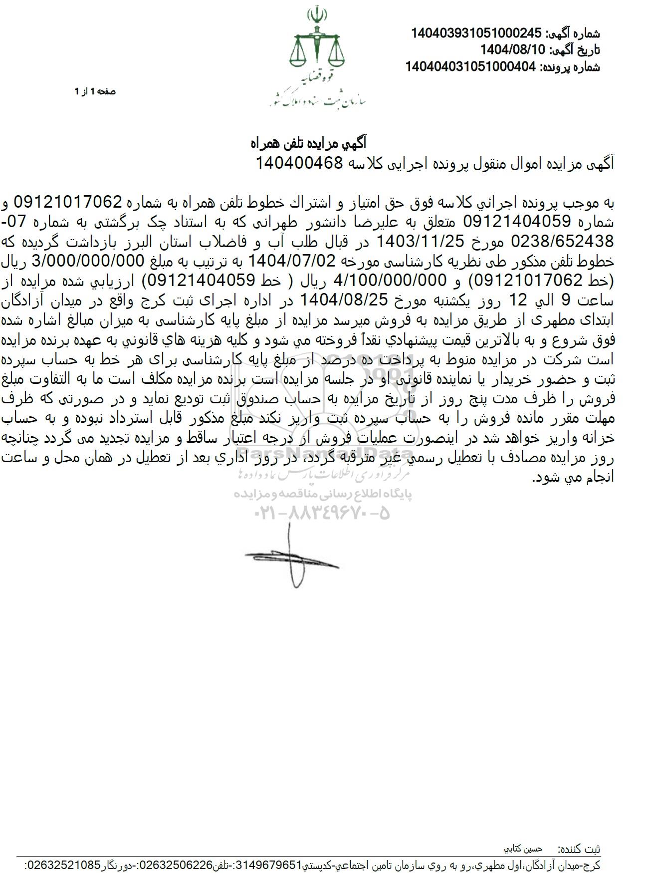 به موجب پرونده اجرائي کلاسه فوق حق امتیاز و اشتراک خطوط تلفن همراه به شماره 09121017062 و شماره 09121404059 متعلق به علیرضا دانشور طهرانی که به استناد چک برگشتی به شماره 07 - 0238.652438 مورخ 1403.11.25 در قبال طلب آب و فاضلاب استان البرز بازداشت گردیده که خطوط تلفن مذکور طی نظریه کارشناسی مورخه 1404.07.02 به ترتیب به مبلغ 3.000.000.000 ريال خط 09121017062 و 4.100.000.000 ريال- خط 09121404059 ارزیابی شده مزایده از( ساعت 9 الي 12 روز یکشنبه مورخ 1404.08.25 در اداره اجرای ثبت کرج واقع در میدان آزادگان ابتدای مطهری از طریق مزایده به فروش میرسد مزایده از مبلغ پایه کارشناسی به میزان مبالغ اشاره شده فوق شروع و به بالاترین قیمت پیشنهادی نقدا فروخته ميشود و کلیه هزينه هاي قانوني به عهده برنده مزایده است شرکت در مزایده منوط به پرداخت ده درصد از مبلغ پایه کارشناسی برای هر خط به حساب سپرده ثبت و حضور خریدار یا نماینده قانونی او در جلسه مزایده است برنده مزایده مکلف است ما به التفاوت مبلغ فروش را ظرف مدت پنج روز از تاریخ مزایده به حساب صندوق ثبت تودیع نماید و در صورتی که ظرف مهلت مقرر مانده فروش را به حساب سپرده ثبت واریز نکند مبلغ مذکور قابل استرداد نبوده و به حساب خزانه واریز خواهد شد در اینصورت عملیات فروش از درجه اعتبار ساقط و مزایده تجدید می گردد چنانچه روز مزایده مصادف با تعطیل رسمي غير مترقبه گردد در روز اداری بعد از تعطیل در همان محل و ساعت انجام می شود.