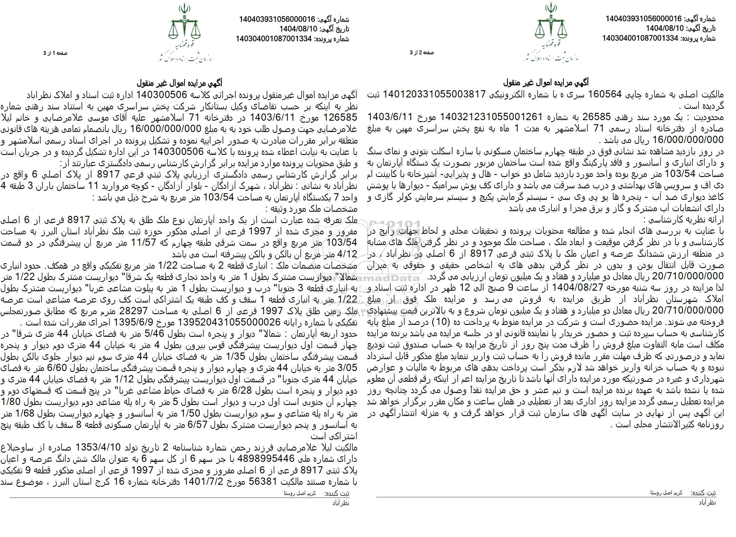آگهی مزایده اموال غیر منقول پرونده اجرائی کلاسه 140300506 اداره ثبت اسناد و املاک نظرآباد