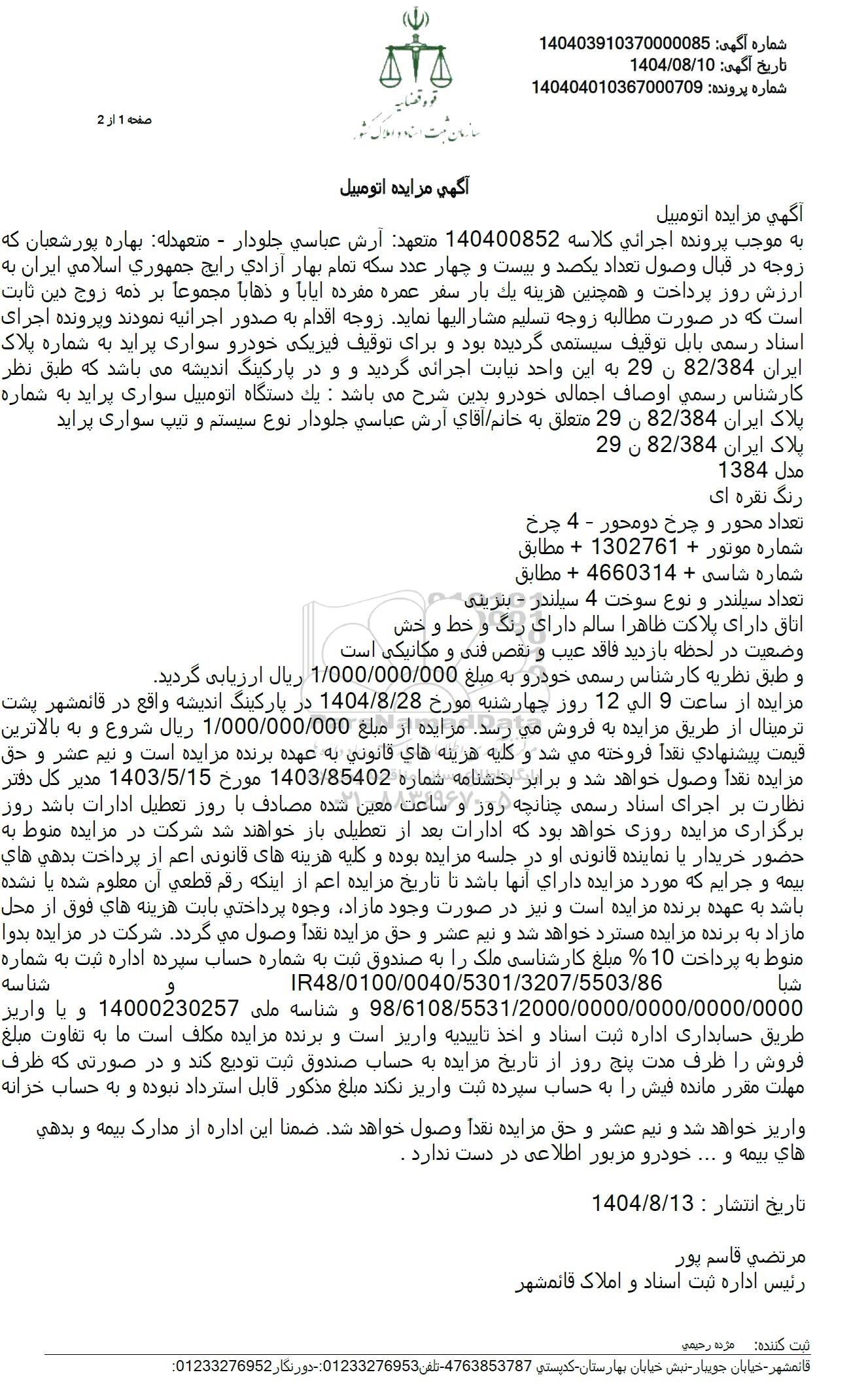 به موجب پرونده اجرائي كلاسه 140400852 متعهد آرش عباسی جلودار - متعهدله بهاره پورشعبان که زوجه در قبال وصول تعداد یکصد و بیست و چهار عدد سکه تمام بهار آزادی رايج جمهوری اسلامی ایران به ارزش روز پرداخت و همچنین هزینه یک بار سفر عمره مفرده ایاب و ذهابا مجموعاً بر ذمه زوج دین ثابت است که در صورت مطالبه زوجه تسليم مشارالیها نماید زوجه اقدام به صدور اجرائیه نمودند و پرونده اجرای استاد رسمی بابل توقیف سیستمی گردیده بود و برای توقیف فیزیکی خودرو سواری پراید به شماره پلاک ایران 82.384 ن 29 به این واحد نیابت اجرائی گردید و و در پارکینگ اندیشه می باشد که طبق نظر کارشناس رسمي اوصاف اجمالی خودرو بدین شرح می باشد: یک دستگاه اتومبیل سواری پراید به شماره پلاک ایران 82.384 ن 29 متعلق به خانم آقای آرش عباسي جلودار نوع سیستم و تیپ سواری پراید