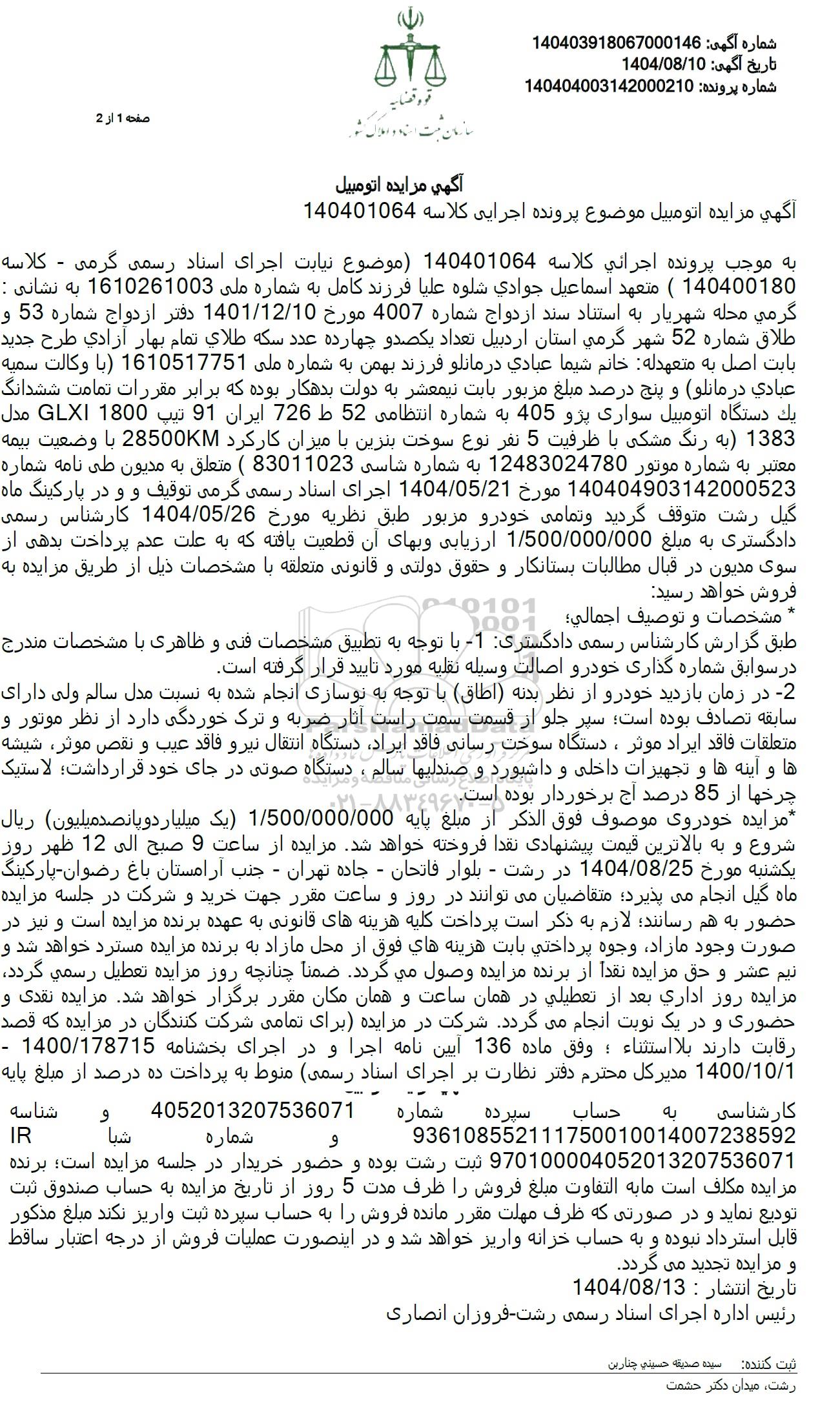 به موجب پرونده اجرائی کلاسه 140401064 (موضوع) نیابت اجرای اسناد رسمی گرمی - کلاسه 140400180 متعهد اسماعیل جوادی شلوه علیا فرزند کامل به شماره ملی 1610261003 به نشانی : گرمی محله شهریار به استناد سند ازدواج شماره 4007 مورخ 1401.12.10 دفتر ازدواج شماره 53 و طلاق شماره 52 شهر گرمی استان اردبیل تعداد یکصد و چهارده عدد سکه طلای تمام بهار آزادی طرح جدید بابت اصل به متعهدله خانم شیما عبادی در مانلو فرزند بهمن به شماره ملی 1610517751 با وکالت سمیه عبادی در مانلو و پنج درصد مبلغ مزبور بابت نیمعشر به دولت بدهکار بوده که برابر مقررات تمامت ششدانگ یک دستگاه اتومبیل سواری پژو 405 به شماره انتظامی 52 726 ایران 91 تیپ 1800 GLXI مدل 1383 به رنگ مشکی با ظرفیت 5 نفر نوع سوخت بنزین با میزان کارکرد 28500KM با وضعیت بیمه معتبر به شماره موتور 12483024780 به شماره شاسی 83011023 ) متعلق به مدیون طی نامه شماره 140404903142000523 مورخ 1404.05.21 اجرای اسناد رسمی گرمی توقیف و و در پارکینگ ماه گیل رشت متوقف گردید و تمامی خودرو مزبور طبق نظریه مورخ 1404.05.26 کارشناس رسمی دادگستری به مبلغ 1.500.000.000 ارزیابی و بهای آن قطعیت یافته که به علت عدم پرداخت بدهی از سوی مدیون در قبال مطالبات بستانکار و حقوق دولتی و قانونی متعلقه با مشخصات ذیل از طریق مزایده به فروش خواهد رسید
