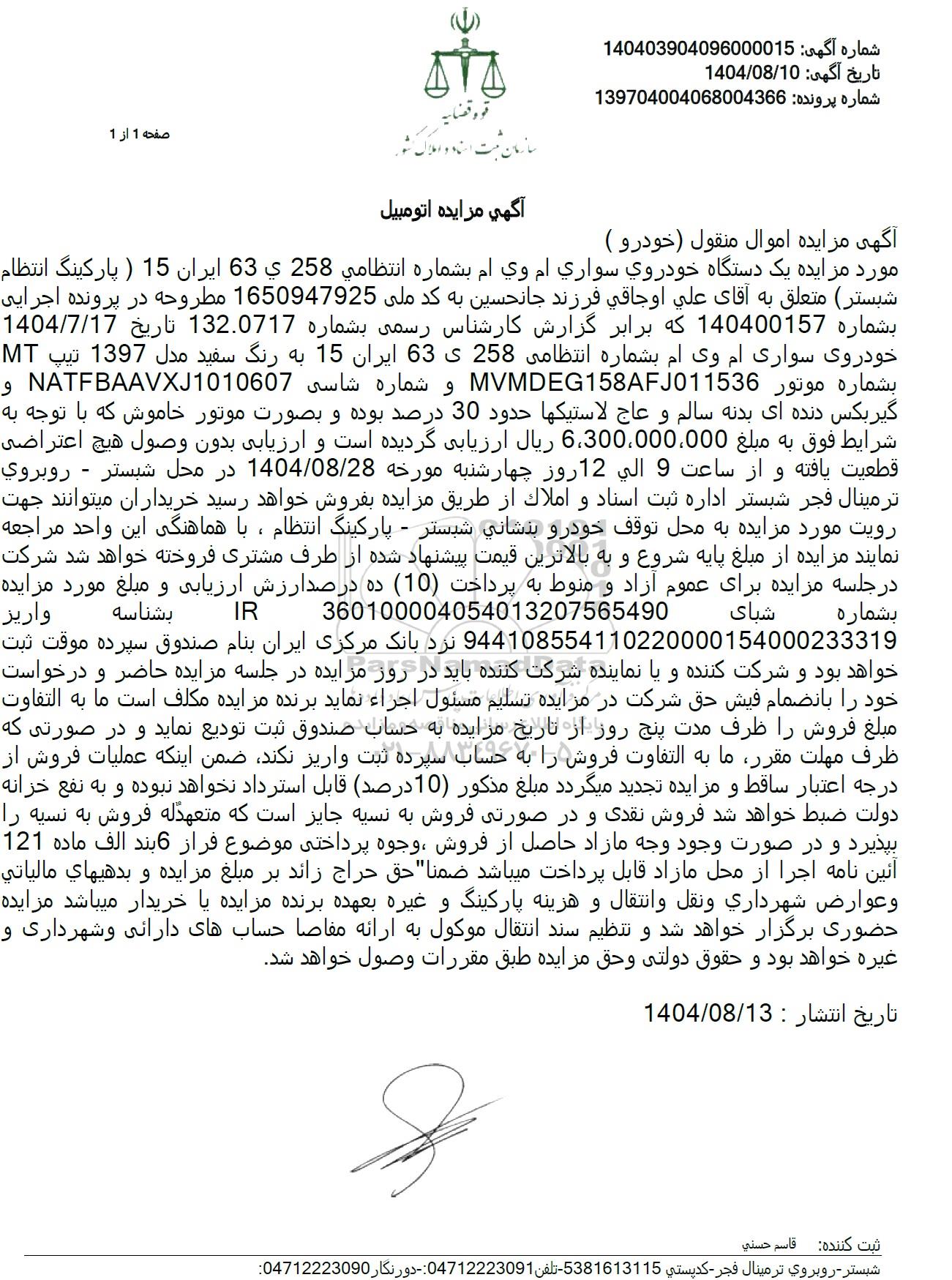 مورد مزایده یک دستگاه خودروی سواری ام وی ام بشماره انتظامی 258 ی 63 ایران 15 پارکینگ انتظام شبستر متعلق به آقای علی اوجاقی فرزند جانحسین به کد ملی 1650947925 مطروحه در پرونده اجرایی 1404.7.17 بشماره 140400157 که برابر گزارش کارشناس رسمی بشماره 132.0717 تاریخ خودروی سواری ام وی ام بشماره انتظامی 258 ی 63 ایران 15 به رنگ سفید مدل 1397 تیپ MT و NATFBAAVXJ1010607 و شماره شاسی MVMDEG158AFJ011536 بشماره موتور گیربکس دنده ای بدنه سالم و عاج لاستیکها حدود 30 درصد بوده و بصورت موتور خاموش که با توجه به شرایط فوق به مبلغ 300،000،000 ، 6 ریال ارزیابی گردیده است و ارزیابی بدون وصول هیچ اعتراضی قطعیت یافته و از ساعت 9 الی 12 روز چهارشنبه مورخه 1404.08.28 در محل شبستر - روبروی ترمینال فجر شبستر اداره ثبت اسناد و املاک از طریق مزایده بفروش خواهد رسید خریداران میتوانند جهت رویت مورد مزایده به محل توقف خودرو بنشانی شبستر - پارکینگ انتظام ، با هماهنگی این واحد مراجعه نمایند مزایده از مبلغ پایه شروع و به بالاترین قیمت پیشنهاد شده از طرف مشتری فروخته خواهد شد شرکت در جلسه مزایده برای عموم آزاد و منوط به پرداخت (10) ده درصد ارزش ارزیابی و مبلغ مورد مزایده