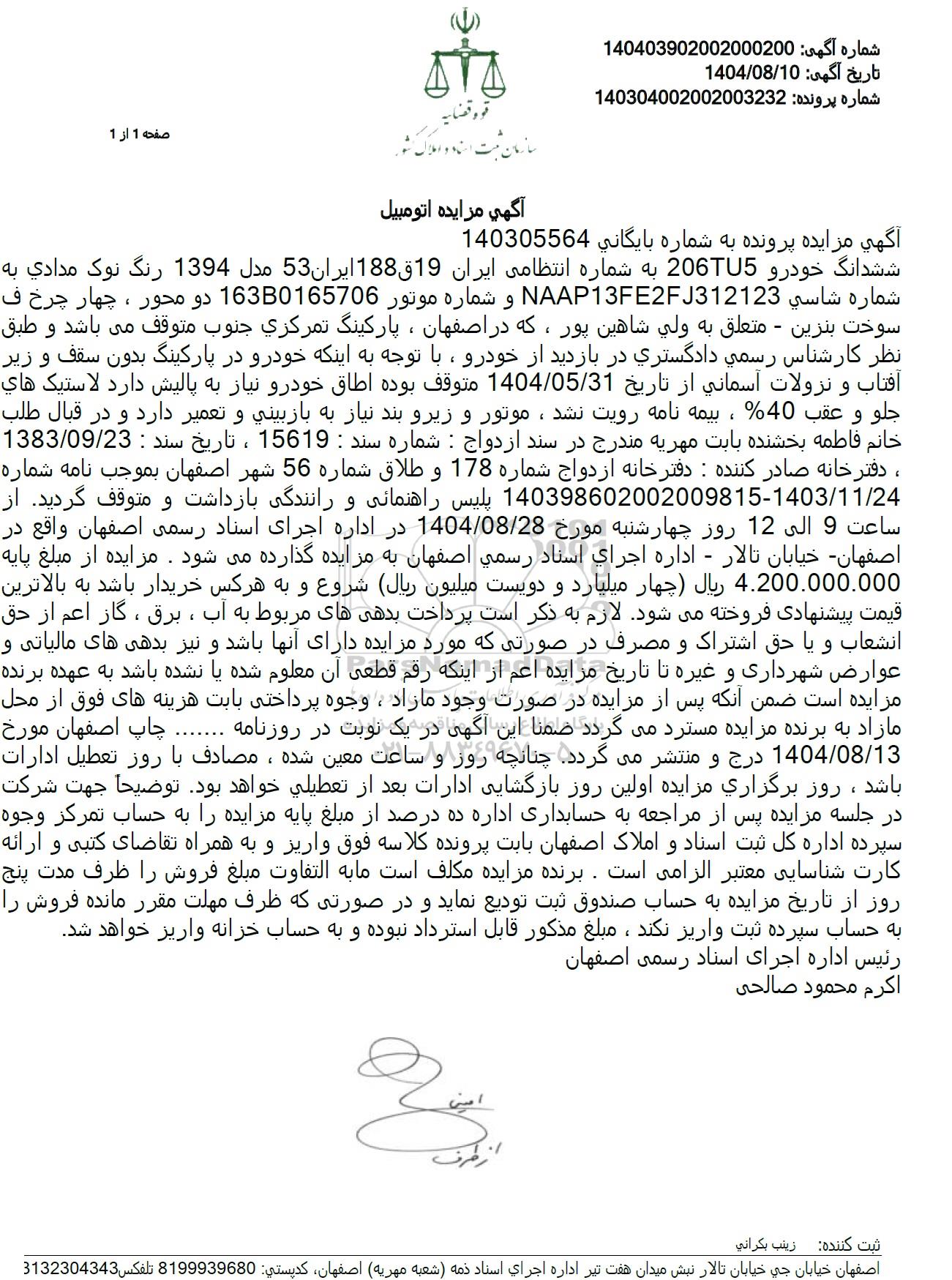 ششدانگ خودرو 206TU5 به شماره انتظامی ایران 19 ق 188 ایران 53 مدل 1394 رنگ نوک مدادي به شماره شاسي NAAP13FE2FJ312123 و شماره موتور 1630165706 دو محور ، چهار چرخ ف سوخت بنزین - متعلق به ولی شاهین پور ، که در اصفهان ، پارکینگ تمرکزی جنوب متوقف می باشد و طبق نظر کارشناس رسمی دادگستری در بازدید از خودرو، با توجه به اینکه خودرو در پارکینگ بدون سقف و زیر آفتاب و نزولات آسمانی از تاریخ 1404.05.31 متوقف بوده اطاق خودرو نیاز به پالیش دارد لاستیک هاي جلو و عقب 40% ، بیمه نامه رویت نشد، موتور و زیرو بند نیاز به بازبینی و تعمیر دارد و در قبال طلب خانم فاطمه بخشنده بابت مهریه مندرج در سند ازدواج : شماره سند : 15619 ، تاریخ سند : 1383.09.23 ، دفتر خانه صادر کننده : دفترخانه ازدواج شماره 178 و طلاق شماره 56 شهر اصفهان بموجب نامه شماره 140398602002009815-1403.11.24 پلیس راهنمائی و رانندگی بازداشت و متوقف گردید. از ساعت 9 الی 12 روز چهارشنبه مورخ 1404.08.28 در اداره اجرای اسناد رسمی اصفهان واقع در اصفهان خیابان تالار - اداره اجراي اسناد رسمي اصفهان به مزایده گذارده میشود. مزایده از مبلغ پایه 4.200.000.000 ريال چهار میلیارد و دویست میلیون ریال شروع و به هرکس خریدار باشد به بالاترین قیمت پیشنهادی فروخته میشود. لازم به ذکر است پرداخت بدهیهای مربوط به آب ، برق ، گاز اعم از حق انشعاب و یا حق اشتراک و مصرف در صورتی که مورد مزایده دارای آنها باشد و نیز بدهی های مالیاتی و عوارض شهرداری و غیره تا تاریخ مزایده اعم از اینکه رقم قطعی آن معلوم شده یا نشده باشد به عهده برنده مزایده است ضمن آنکه پس از مزایده در صورت وجود مازاد ، وجوه پرداختی بابت هزینه های فوق از محل مازاد به برنده مزایده مسترد میگردد ضمنا این آگهی در یک نوبت در روزنامه چاپ اصفهان مورخ 1404.08.13 درج و منتشر میگردد چنانچه روز و ساعت معین شده ، مصادف با روز تعطیل ادارات باشد ، روز برگزاری مزایده اولین روز بازگشایی ادارات بعد از تعطیلی خواهد بود توضیحاً جهت شرکت در جلسه مزایده پس از مراجعه به حسابداری اداره ده درصد از مبلغ پایه مزایده را به حساب تمرکز وجوه سپرده اداره کل ثبت اسناد و املاک اصفهان بابت پرونده کلاسه فوق واریز و به همراه تقاضای کتبی و ارائه کارت شناسایی معتبر الزامی است. برنده مزایده مکلف است ما به التفاوت مبلغ فروش را ظرف مدت پنج روز از تاریخ مزایده به حساب صندوق ثبت تودیع نماید و در صورتی که ظرف مهلت مقرر مانده فروش را به حساب سپرده ثبت واریز نکند ، مبلغ مذکور قابل استرداد نبوده و به حساب خزانه واریز خواهد شد. رئیس اداره اجرای اسناد رسمی اصفهان