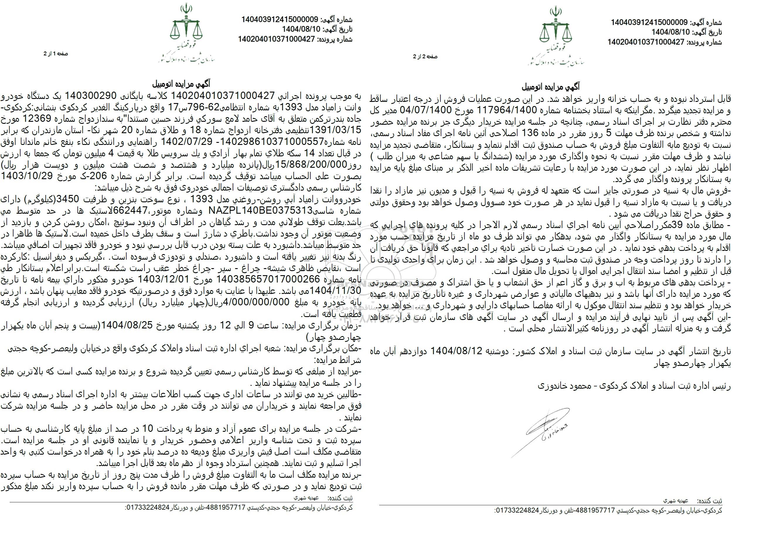 | عنوان آگهی: مزایده یک دستگاه خودرو وانت زامیاد مدل 1393 |