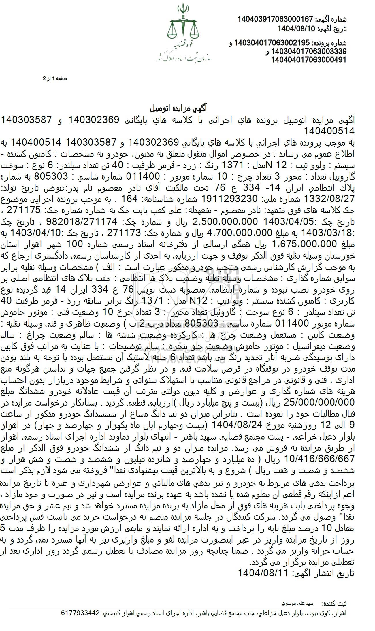 به موجب پرونده های اجرائی با کلاسه های بایگانی 140302369 و 140303587 140400514 به اطلاع عموم میرساند در خصوص اموال منقول متعلق به مدیون خودرو به مشخصات : کامیون کشنده -سیستم : ولوو تیب : 12 N مدل : 1371 رنگ زرد - قرمز ظرفیت : 40 تن تعداد سیلندر 6 نوع : سوخت گاروبیل تعداد : محور 3 تعداد چرخ : 10 شماره موتور : 011400 شماره شاسی : 805303 به شماره بلاک انتظامی ایران -14 - 334 ع 76 تحت مالکیت آقای نادر معصوم نام پدر عوض تاریخ تولد: 1332.08.27 شماره ملی 1911293230 شماره شناسنامه 164 . به موجب پرونده اجرایی موضوع چک کلاسه های فوق متعهد نادر معصوم - متعهدله : علی کعب بابت چک به شماره شماره چک 271175 ، تاریخ چک 1403.04.05 2.500.000.000 ریال و شماره چک 982018.271174 ، تاریخ چک 1403.03.18 به مبلغ 4.700.000.000 ریال و شماره چک 271173، تاریخ چک : 1403.04.10 به: مبلغ 1,675،000،000 ریال همگی ارسالی از دفترخانه اسناد رسمی شماره 100 شهر اهواز استان خوزستان وسیله نقلیه فوق الذکر توقیف و جهت ارزیابی به احدی از کارشناسان رسمی دادگستری ارجاع که به موجب گزارش کارشناس رسمی منتخب خودرو مذکور عبارت است : الف ) مشخصات وسیله نقلیه برابر سوابق شماره گذاری : مشخصات وسیله نقلیه وضعیت پلاکها انتظامی : جفت پلاکهای انتظامی اصلی بر روی خودرو نصب نبوده و شماره انتظامی منصوبه دست نویس 76 ع 334 ایران 14 قید گردیده نوع کاربری : کامیون کشنده سیستم : ولو تیپ : N12 مدل : 1371 رنگ برابر سابقه زرد - قرمز ظرفیت 40 تن تعداد سینادر : 6 نوع سوخت : گازوئیل تعداد محور : 3 تعداد چرخ 10 وضعیت فنی : موتور خاموش شماره موتور 011400 شماره شاسی : 805303 تعداد درب 2 ب ) وضعیت ظاهری و فنی وسیله نقلیه : وضعیت کابین: مستعمل وضعیت چرخها : کارکرده وضعیت شیشه ها : سالم وضعیت چراغ : سالم وضعیت دیفرانسیل : موتور خاموش وضعیت جلو پنجره : سالم توضیحات : با عنایت به مراتب فوق کابین دارای پوسیدگی ضربه آثار تجدید رنگ میباشد تعداد 6 حلقه لاستیک آن مستعمل بوده با توجه به بلند بودن مدت توقف خودرو در توقفگاه در فرض سلامت فنی و در نظر گرفتن جمیع جهات و نداشتن هرگونه منع اداری، فنی و قانونی در مراجع قانونی متناسب با استهلاک سنواتی و شرایط موجود در بازار بدون احتساب هزینه های شماره گذاری و عوارض و کلیه دیون دولتی مترتب آن قیمت عادلانه خودرو ششدانگ مبلغ 25.000.000.000 ریال بیست و پنج میلیارد ریال ( ارزیابی قطعی گردید . بستانکار درخواست مزایده در قبال مطالبات خود را نموده است. بنابر این میزان دو نیم دانگ مشاع از شششدانگ خودرو مذکور از ساعت 9 الى 12 روزشنبه مورخ 1404.08.24 بیست و چهارم آبان ماه یکهزار و چهارصد و چهار در اهواز بلوار دعبل خزاعی - پشت مجتمع قضایی شهید باهنر - انتهای بلوار دماوند اداره اجرای اسناد رسمی اهواز از طریق مزایده به فروش میرسد. مزایده میزان دو و نیم دانگ از ششدانگ خودرو فوق الذکر از مبلغ 10.416.666.667 ریال ده میلیارد و چهارصد و شانزده میلیون و ششصد و شصت و شش هزار و ششصد و شصت و هفت ریال ( شروع و به بالاترین قیمت پیشنهادی نقدا فروخته میشود لازم بذکر است. پرداخت بدهی های مربوط به خودرو و نیز بدهی های مالیاتی و عوارض شهرداری و غیره تا تاریخ مزایده اعم از اینکه رقم قطعی آن معلوم شده یا نشده باشد به عهده برنده مزایده است و نیز در صورت وجود مازاد . وجوه پرداختی بابت هزینه های فوق از محل مازاد به برنده مزایده مسترد خواهد شد و نیم عشر و حق مزایده نقدا وصول می گردد. شرکت کنندگان در جلسه مزایده منضم به درخواست خرید می بایست فیش پرداختی معادل 10 درصد مبلغ پایه را پرداخت و به اداره ارائه نمایند و مابقی ارزش مورد مزایده را ظرف مدت 5 روز از تاریخ مزایده واریز در غیر اینصورت مزایده لغو و مبلغ واریزی نیز به آنها مسترد نمی گردد و به حساب خزانه واریز می گردد . ضمنا چنانچه روز مزایده مصادف با تعطیل رسمی گردد روز اداری بعد از تعطیلی مزایده برگزار می گردد.