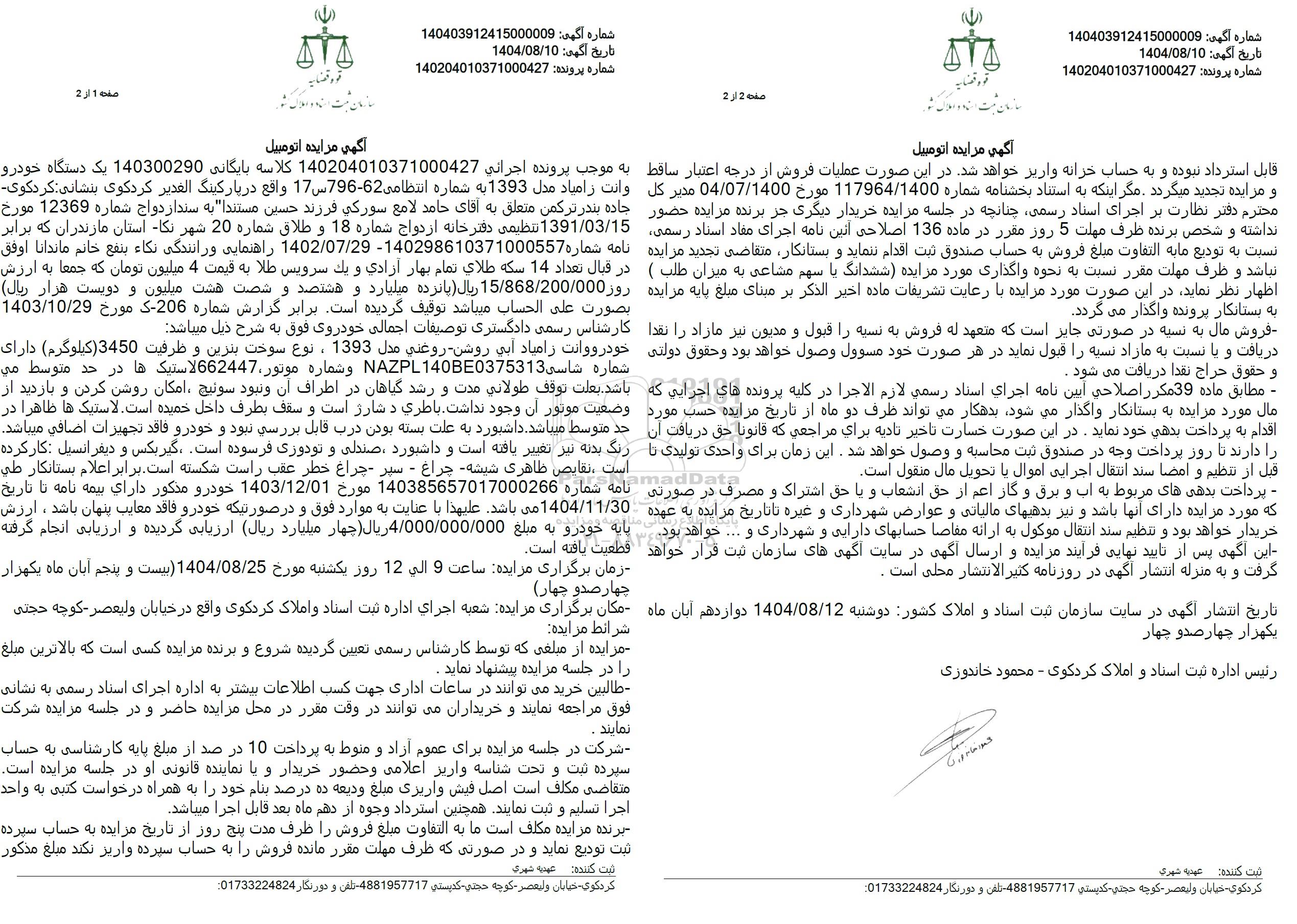 | عنوان آگهی: مزایده یک دستگاه خودرو وانت زامیاد مدل 1393 |