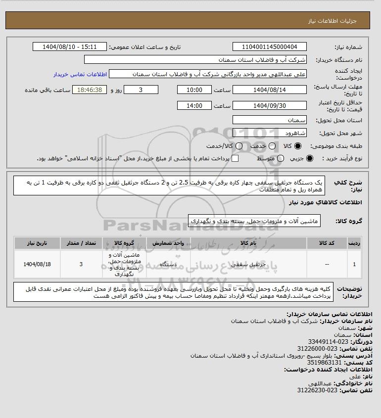 تلفن:5- 88349670 (021) فکس: 88349673 (021) Website: www.ParsNamadData.com E-mail: Info@ParsNamadData.com استعلام یک دستگاه جرثقیل سقفی چهار کاره برقی به ظرفیت 2.5 تن و 2 دستگاه جرثقیل ثقفی دو کاره برقی به ظرفیت 1 تن به همراه ریل و تمام متعلقات