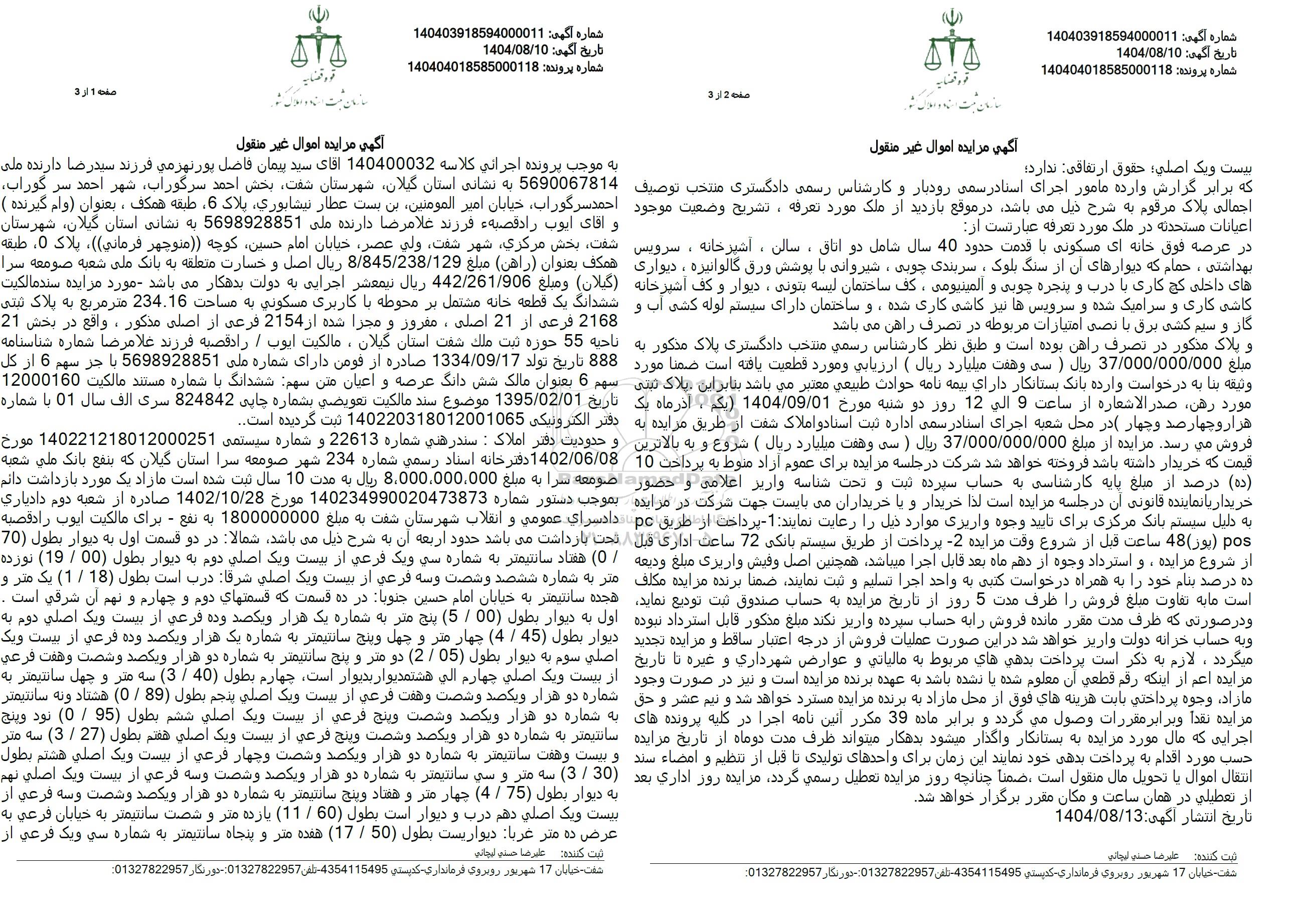 به موجب پرونده اجرائی کلاسه 140400032 آقای سید پیمان فاصل پورنهرمي فرزند سیدرضا دارنده ملی 5690067814 به نشانی استان گیلان شهرستان شفت بخش احمد سرگوراب، شهر احمد سر گوراب احمد سرگوراب خیابان امیر المومنین بن بست عطار نیشابوری، پلاک 6 طبقه همکف ، بعنوان (وام گیرنده ) و آقای ایوب راد قصبه فرزند غلامرضا دارنده ملی 5698928851 به نشانی استان گیلان شهرستان شفت بخش مرکزي شهر شفت ولي عصر خیابان امام حسین کوچه منوچهر فرمانی))، پلاک ۵ طبقه همکف بعنوان (راهن) مبلغ 8.845.238.129 ریال اصل و خسارت متعلقه به بانک ملی شعبه صومعه سرا (گیلان) و مبلغ 442.261.906 ریال نیمعشر اجرایی به دولت بدهکار میباشد مورد مزایده سند مالکیت ششدانگ یک قطعه خانه مشتمل بر محوطه با کاربری مسکونی به مساحت 234.16 متر مربع به پلاک ثبتی 2168 فرعی از 21 اصلی، مفرور و مجزا شده از 2154 فرعی از اصلی مذکور، واقع در بخش 21 ناحیه 55 حوزه ثبت ملك شفت استان گیلان، مالکیت ایوب / راد قصبه فرزند غلامرضا شماره شناسنامه 888 تاریخ تولد 1334.09.17 صادره از قومن دارای شماره ملی 5698928851 با جز سهم 6 از کل سهم 6 بعنوان مالک شش دانگ عرصه و اعیان متن سهم ششدانگ با شماره مستند مالکيت 12000160 تاریخ 1395.02.01 موضوع سند مالكيت تعويضي بشماره چایی 824842 سری الف سال 01 با شماره دفتر الکترونیکی 140220318012001065 ثبت گردیده است...