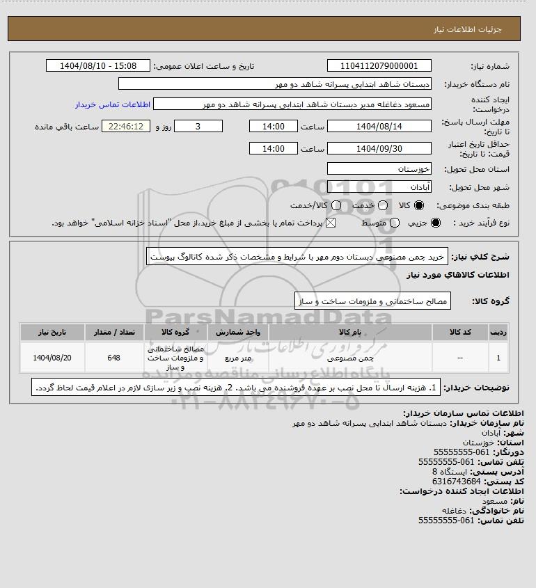 تلفن:5- 88349670 (021) فکس: 88349673 (021) Website: www.ParsNamadData.com E-mail: Info@ParsNamadData.com استعلام خرید چمن مصنوعی دبستان دوم مهر با شرایط و مشخصات ذکر شده کاتالوگ پیوست