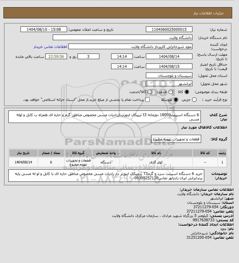 تلفن:5- 88349670 (021) فکس: 88349673 (021) Website: www.ParsNamadData.com E-mail: Info@ParsNamadData.com استعلام 6 دستگاه اسپیلت18000 دوزمانه t3 ترپیکال اینورترداررادیات مسی مخصوص مناطق گرم و حاره ای همراه ب کابل و لوله مسی