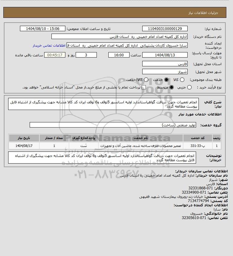 تلفن:5- 88349670 (021) فکس: 88349673 (021) Website: www.ParsNamadData.com E-mail: Info@ParsNamadData.com استعلام انجام تعمیرات جهت دریافت گواهیاستاندارد اولیه اسانسور 5توقف و6 توقف ایران کد کالا مشابه جهت پیشگیری از اشتباه فایل پیوست مطالعه گردد