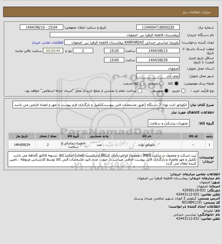 تلفن:5- 88349670 (021) فکس: 88349673 (021) Website: www.ParsNamadData.com E-mail: Info@ParsNamadData.com استعلام انکوباتور ثابت نوزاد 2 دستگاه (طبق مشخصات فنی پیوست)تکمیل و بارگذاری فرم پیوست با مهر و امضاء الزامی می باشد