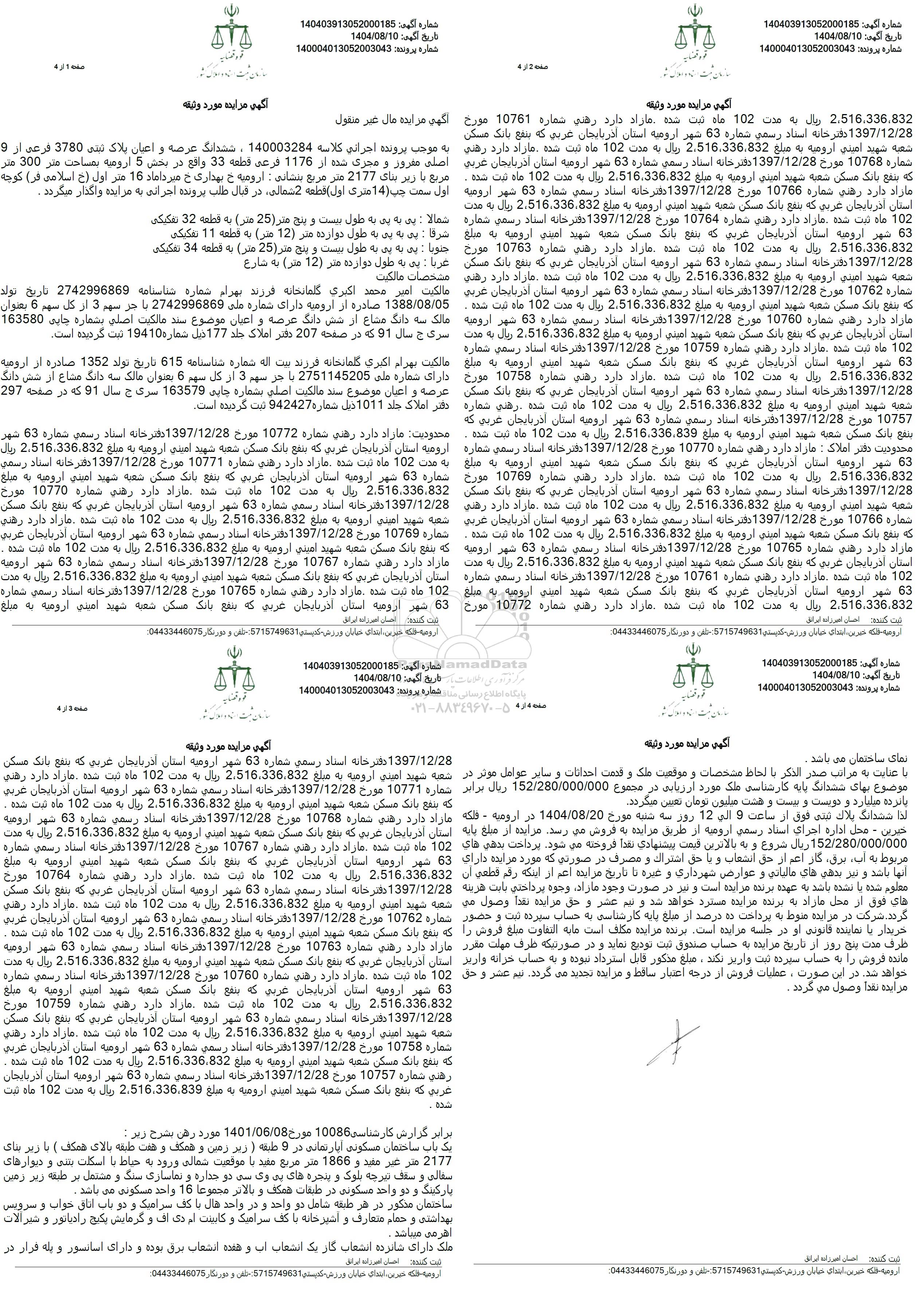 محدودیت مازاد دارد رهني شماره 10772 مورخ 1397.12.28 دفترخانه اسناد رسمی شماره 63 شهر ارومیه استان آذربایجان غربی که بنفع بانک مسکن شعبه شهید امینی ارومیه به مبلغ 832، 336، 2،516 ريال به مدت 102 ماه ثبت شده مازاد دارد رهني شماره 10771 مورخ 1397.12.28 دفترخانه اسناد رسمي شماره 63 شهر ارومیه استان آذربایجان غربی که بنفع بانک مسکن شعبه شهید امینی ارومیه به مبلغ 832، 336، 2،516 ریال به مدت 102 ماه ثبت شده مازاد دارد رهني شماره 10770 مورخ 1397.12.28 دفترخانه اسناد رسمی شماره 63 شهر ارومیه استان آذربایجان غربی که بنفع بانک مسکن شعبه شهید امینی ارومیه به مبلغ 832، 336، 2,516 ریال به مدت 102 ماه ثبت شده مازاد دارد رهني شماره 10769 مورخ 1397.12.28 دفترخانه اسناد رسمی شماره 63 شهر ارومیه استان آذربایجان غربی که بنفع بانک مسکن شعبه شهید اميني ارومیه به مبلغ 336,832، 2,516 ریال به مدت 102 ماه ثبت شده . مازاد دارد رهني شماره 10767 مورخ 1397.12.28 دفترخانه اسناد رسمی شماره 63 شهر ارومیه استان آذربایجان غربی که بنفع بانک مسکن شعبه شهید امینی ارومیه به مبلغ 2.516.336.832 ریال به مدت 102 ماه ثبت شده مازاد دارد رهني شماره 10765 مورخ 1397.12.28 دفترخانه اسناد رسمی شماره 63 شهر ارومیه استان آذربایجان غربی که بنفع بانک مسکن شعبه شهيد امينی ارومیه به مبلغ 2.516.336.832 ریال به مدت 102 ماه ثبت شده