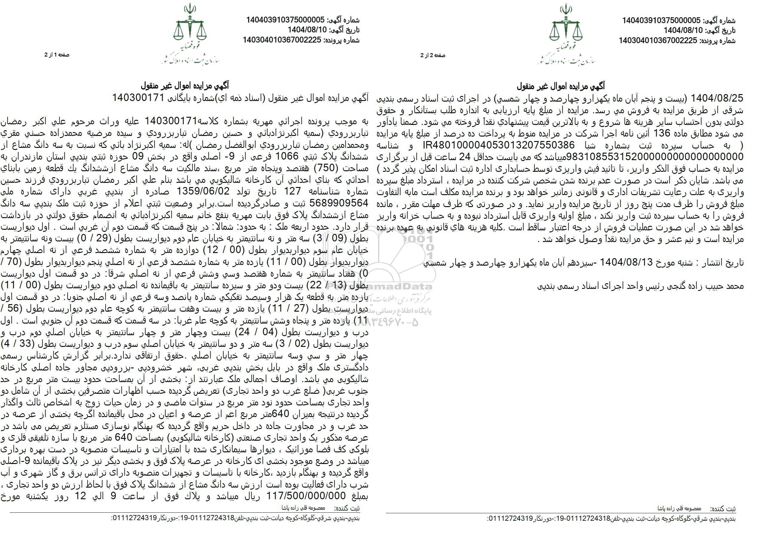 به موجب پرونده اجرائي مهریه بشماره كلاسه 140300171 عليه وراث مرحوم علي اكبر رمضان تبار بر رودی (سمیه اکبرنژادیانی و حسین رمضان تبار بر رودی و سیده مرضیه محمدزاده حسني مقري ، و محمد امين رمضان تبار بر رودي ابو الفضل رمضان) له سميه اکبرنژاد باتي که نسبت به سه دانگ مشاع از ششدانگ پلاک ثبتی 1066 فرعی از - اصلی واقع در بخش 09 حوزه ثبتي بندپی استان مازندران به ) مساحت (750) هفتصد و پنجاه متر مربع سند مالکیت سه دانگ مشاع از ششدانگ یک قطعه زمین بابناي احداثی که بنای احداثي آن کارخانه شالیکوبي مي باشد بنام علی اکبر رمضان تبار بزرودي فرزند حسین شماره شناسنامه 127 تاریخ تولد 1359.06.02 صادره از بندپی غربی دارای شماره ملی 5689909564 ثبت و صادر گردیده است. برابر وضعیت ثبتی اعلام از حوزه ثبت ملک بندپی سه دانگ مشاع از ششدانگ پلاک فوق بابت مهریه بنفع خانم سمیه اکبرنژادیانی به انضمام حقوق دولتی در بازداشت قرار دارد. حدود اربعه ملک : به حدود شمالا در پنج قسمت که قسمت دوم آن غربی است . اول دیواریست بطول (09 . 3) سه متر و به سانتیمتر به خیابان عام دوم دیواریست بطول (29 . 0) بیست و نه سانتیمتر به خیابان عام سوم دیوار بديوار بطول (00 . 12) دوازده متر به شماره ششصد فرعی از نه اصلی چهارم دیوار بدیوار بطول (00 . 11) یازده متر به شماره ششصد فرعی از نه اصلی پنجم دیوار بديوار بطول (70 .0) هفتاد سانتیمتر به شماره هفتصد و سی وشش فرعی از نه اصلی شرقا در دو قسمت اول دیواریست بطول (13 . 22) بیست و دو متر و سیزده سانتیمتر به باقیمانده به اصلی دوم دیواریست بطول (00 . 11) یازده متر به قطعه یک هزار و سيصد تفكيكي شماره پانصد و سه فرعی از نه اصلي جنوبا در دو قسمت اول دیواریست بطول (27 . 11) یازده متر و بیست و هفت سانتیمتر به کوچه عام دوم دیواریست بطول (56 .11) یازده متر و پنجاه و شش سانتیمتر به کوچه عام غربا در سه قسمت که قسمت دوم آن جنوبی است . اول درب و دیواریست بطول (04 . 24) بیست و چهار متر و چهار سانتیمتر به خیابان اصلی دوم درب و دیواریست بطول (3.02) سه متر و دو سانتیمتر به خیابان اصلی سوم درب و دیواریست بطول (33 . 4) چهار متر و سی و سه سانتیمتر به خیابان اصلی حقوق ارتفاقی ندارد برابر گزارش کارشناس رسمی دادگستری ملک واقع در بابل بخش بندپی غربی شهر خشرودپی بزرودپی مجاور جاده اصلی کارخانه شالیکوبی می باشد. اوصاف اجمالی ملک عبارتند از بخشی از آن بمساحت حدود بیست متر مربع در حد جنوب غربی ضلع غرب دو واحد تجاری تعریض گردیده حسب اظهارات متصرفین بخشی از آن شامل دو واحد تجاری بمساحت حدود نود متر مربع در سنوات ماضی و در زمان حیات زوج به اشخاص ثالث واگذار گردیده در نتیجه بمیزان 640 متر مربع اعم از عرصه و اعیان در محل باقیمانده اگرچه بخشی از عرصه در حد غرب و در مجاورت جاده در داخل حریم واقع گردیده که بهنگام نوسازی مستلزم تعریض می باشد در عرصه مذکور یک واحد تجاری صنعتی کارخانه شالیکوبی بمساحت 640 متر مربع با سازه تلفیقی فلزی و بلوكي كف فضا موراتیک، دیوارها سیمانکاری شده با امتیازات و تاسیسات منصوبه در دست بهره برداری میباشد در وضع موجود بخشی ای کارخانه در عرصه پلاک فوق و بخشی دیگر نیز در پلاک باقیمانده 9- اصلی واقع گردیده و بهنگام بازدید کارخانه با تاسیسات و تجهیزات منصوبه دارای ترانس برق و گار شهری و آب شرب دارای فعالیت بوده است ارزش سه دانگ مشاع از ششدانگ پلاک فوق با لحاظ ارزش دو واحد تجاری ، بمبلغ 117.500.000.000 ریال میباشد و بلاك فوق از ساعت 9 الی 12 روز یکشنبه مورخ 1404.8.25 (بیست و پنجم آبان ماه یکهزار و چهارصد و چهار شمسی) در اجرای ثبت اسناد رسمی بندید شرقی از طریق مزایده به فروش می رسد. مزایده از مبلغ پایه ارزیابی به اندازه طلب بستانکار و حقوق دولتی بدون احتساب سایر هزینه ها شروع و به بالاترین قیمت پیشنهادي نقدا فروخته می شود. ضمنا یاداور میشود مطابق ماده 136 آئین نامه اجرا شرکت در مزایده منوط به پرداخت ده درصد از مبلغ پایه مزایده (به حساب سپرده ثبت بشماره شبا IR480100004053013207550386 و شناسه 983108553152000000000000000000 میباشد که می ب