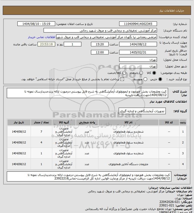 تلفن:5- 88349670 (021) فکس: 88349673 (021) Website: www.ParsNamadData.com E-mail: Info@ParsNamadData.com استعلام کیت وملزومات بخش هورمون و ایمونولوژی آزمایشگاهی به شرح فایل پیوستی-درصورت ارائه برندجدیدارسال نمونه تا 1404/08/12جهت دریافت تاییدیه