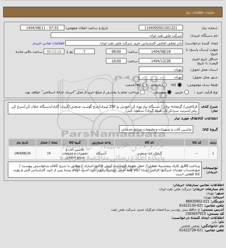 تلفن:5- 88349670 (021) فکس: 88349673 (021) Website: www.ParsNamadData.com E-mail: Info@ParsNamadData.com استعلام فرکامبی/ گرمخانه برقی/ دستگاه پیاز پوره کن/خورش پز 250 لیتری/چرخ گوشت صنعتی/گریدل گازی/دستگاه خلال کن/سرخ کن ریلی/شربت سردکن/آب میوه گیری/ سلفون کش