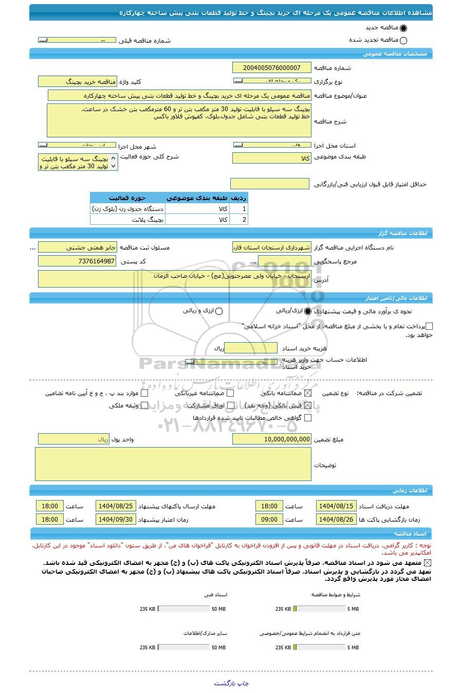 مناقصه مناقصه عمومی یک مرحله ای خرید بچینگ و خط تولید قطعات بتنی پیش ساخته چهارکاره
