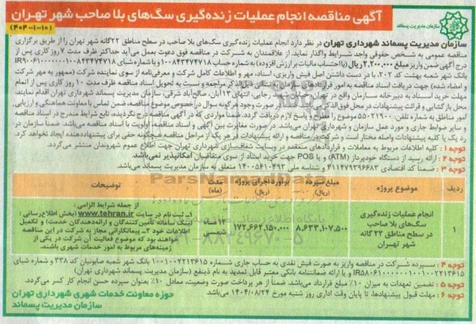 آگهی مناقصه انجام عملیات زنده گیری سگ های بلاصاحب شهر تهران 10-1-404