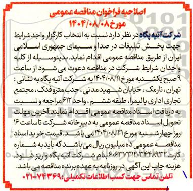 تلفن:5- 88349670 (021) فکس: 88349673 (021) Website: www.ParsNamadData.com E-mail: Info@ParsNamadData.com اصلاحیه فراخوان مناقصه عمومی انتخاب کارگزار واجد شرایط جهت پخش تبلیغات در صدا و سیمای جمهوری اسلامی ایران